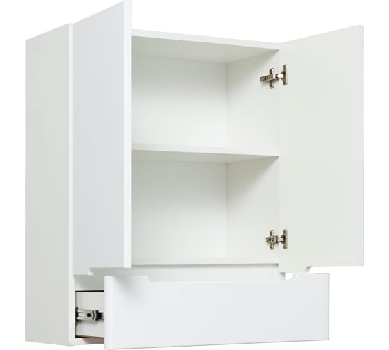 Шкаф навесной с двумя распашными дверками и нижним выдвижным ящиком. За дверками - одна внутренняя полка. Петли со встроенным доводчиком, ящик на шариковых направляющих полного выдвижения.