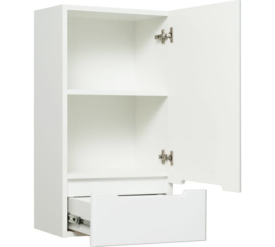 Шкаф навесной с одной дверкой и нижним выдвижным ящиком. За дверкой - одна внутренняя полка. Петли со встроенным доводчиком, ящик на шариковых направляющих полного выдвижения. Выпускается только в правом исполнении.