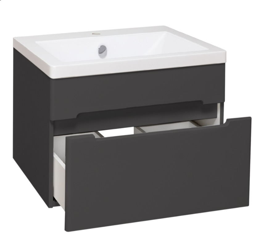 Тумба с раковиной RUNO ПАРМА - сочетание безупречного стиля и современных тенденций в дизайнерском оформлении ванной комнаты. Тумба для ванной ПАРМА (подвесная) - выполнена в модном цвете графит и гармонично впишется в интерьер ванной комнаты в стиле хай-тэк и минимализм. Тумба в ванную оснащена выдвижным ящиком на шариковых направляющих, с системой плавного закрывания. В комплект тумбы входят 2 навеса для крепления к стене. Тумба для ванной комплектуется раковиной из литьевого мрамора «OMEGA» (600*460 мм), глубиной 16 см. Мебель для ванной RUNO - красота и практичность в мелочах!