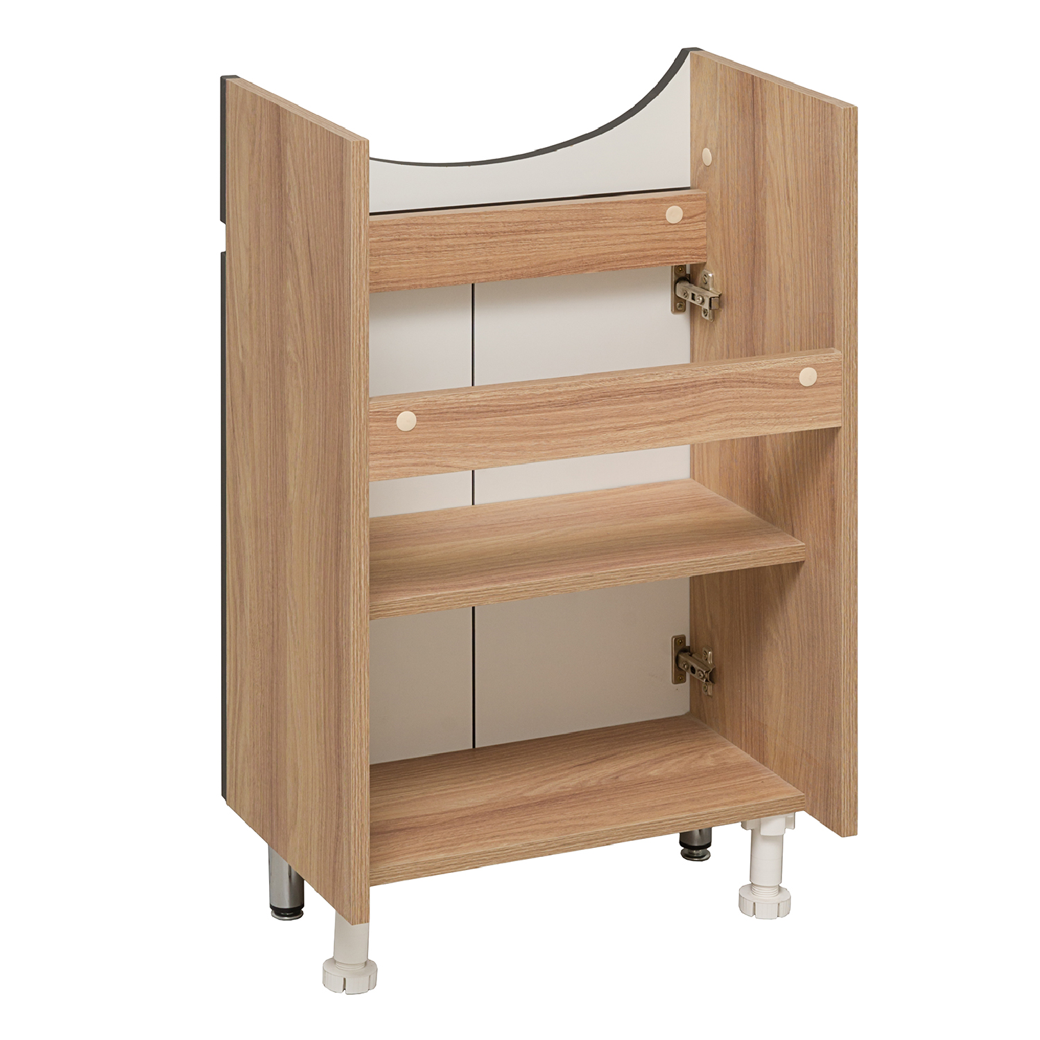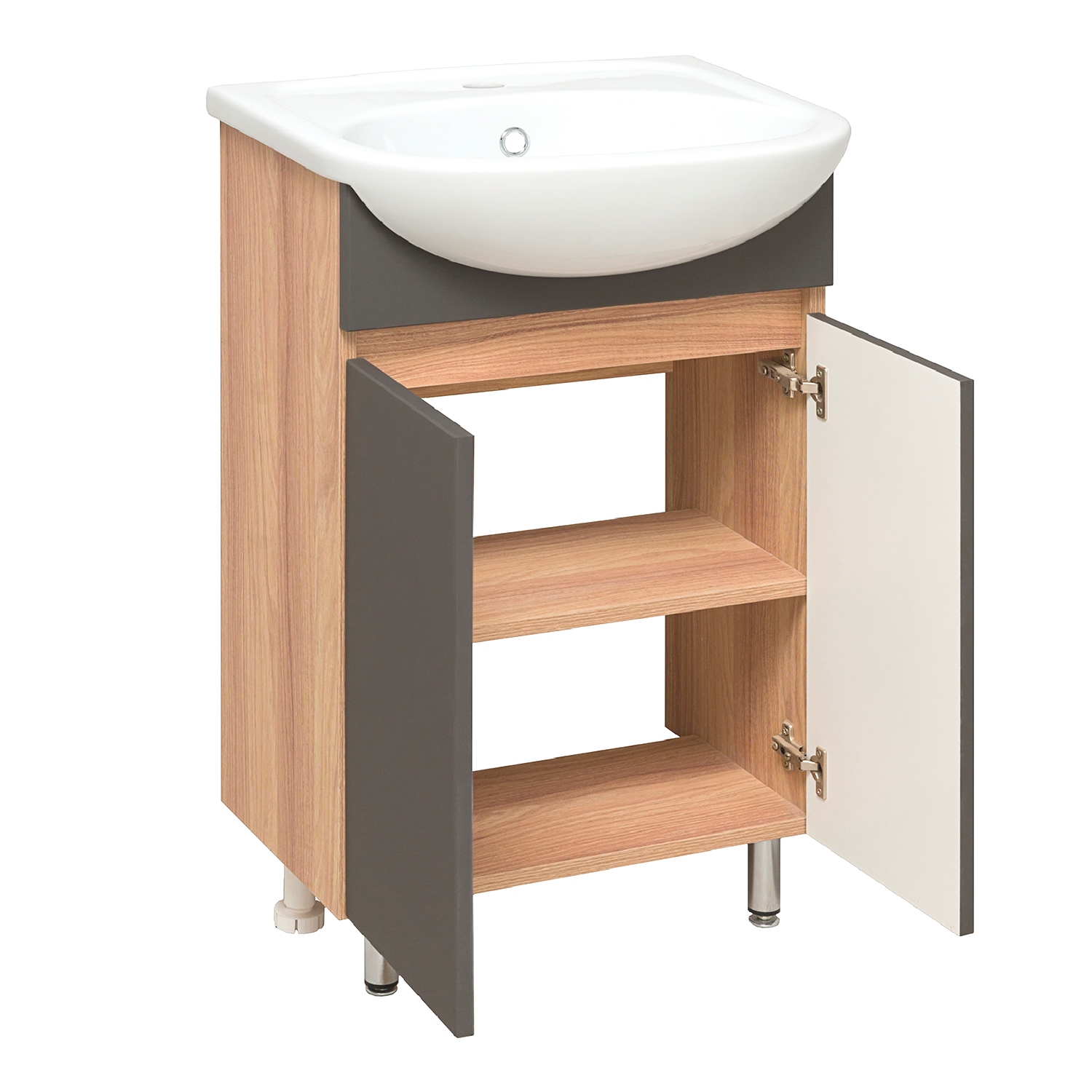 Тумба с раковиной RUNO ЛАДА - модное и оригинальное решение для бюджетного оснащения ванной комнаты. Тумба под раковину ЛАДА (напольная) выполнена в двух цветах - классическом белом и в стильном цвете - графит/серый дуб . Тумба в ванную имеет две распашные дверцы и одну внутреннюю полку. В комплекте идут петли со встроенным доводчиком, 2 хромированные и 2 пластиковые ножки. Тумба для ванной комплектуется керамической раковиной "Уют" (500*420 мм). Раковина имеет глубину 18 см. Мебель для ванной RUNO - красота и практичность в мелочах!