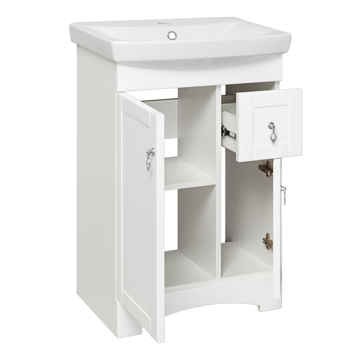 Коллекция мебели «Мерида» выполнена в классическом стиле. Четкие и лаконичные формы, продуманный функционал помогут украсить интерьер любой ванной комнаты. Тумба напольная с двумя распашными фасадами и боковым выдвижным ящиком справа. За левым фасадом - одна внутренняя полка. Ящик - на шариковых направляющих полного выдвижения, петли со встроенным доводчиком, ручки - 3шт, ножки пластик - 4шт (скрыты за нижней фальш-панелью)