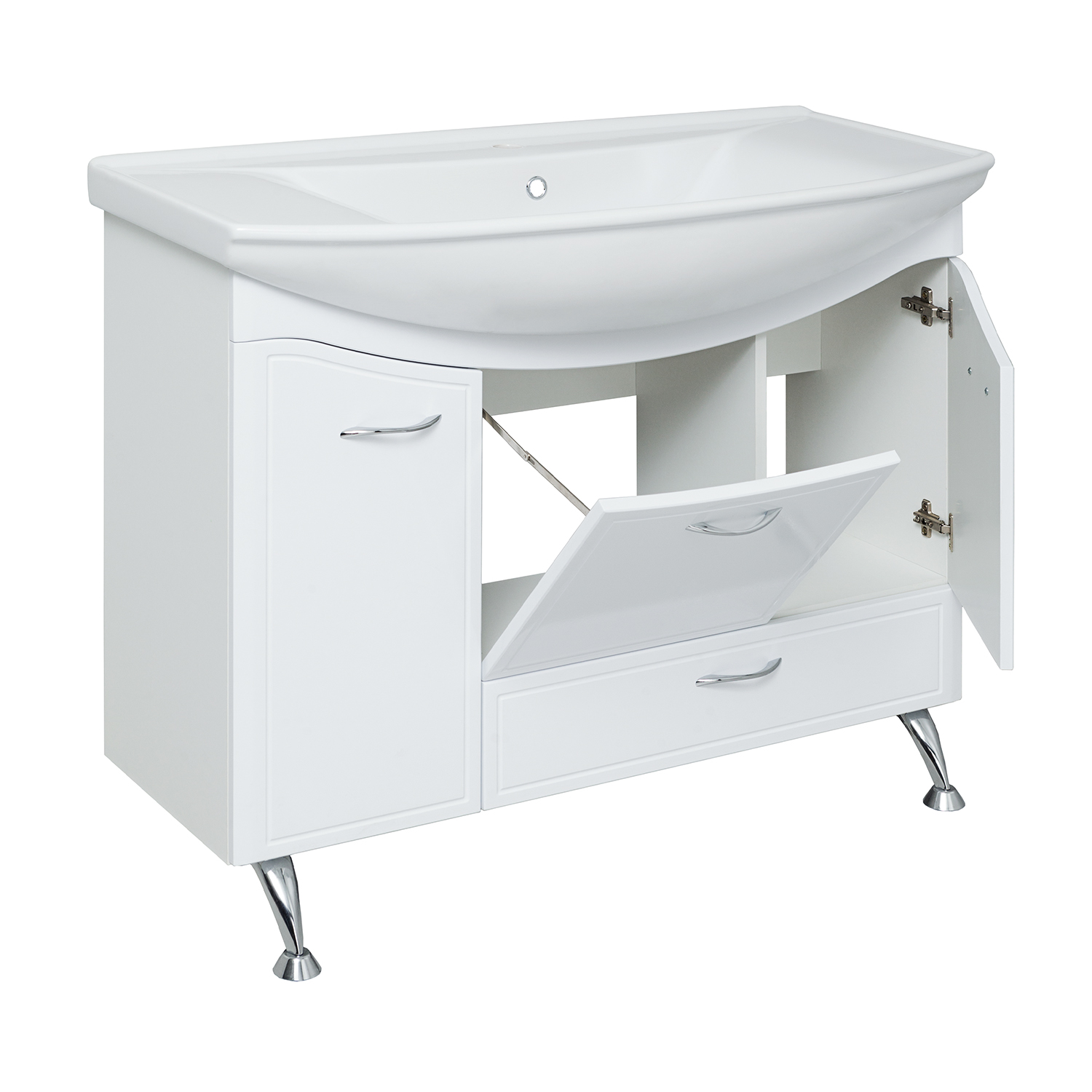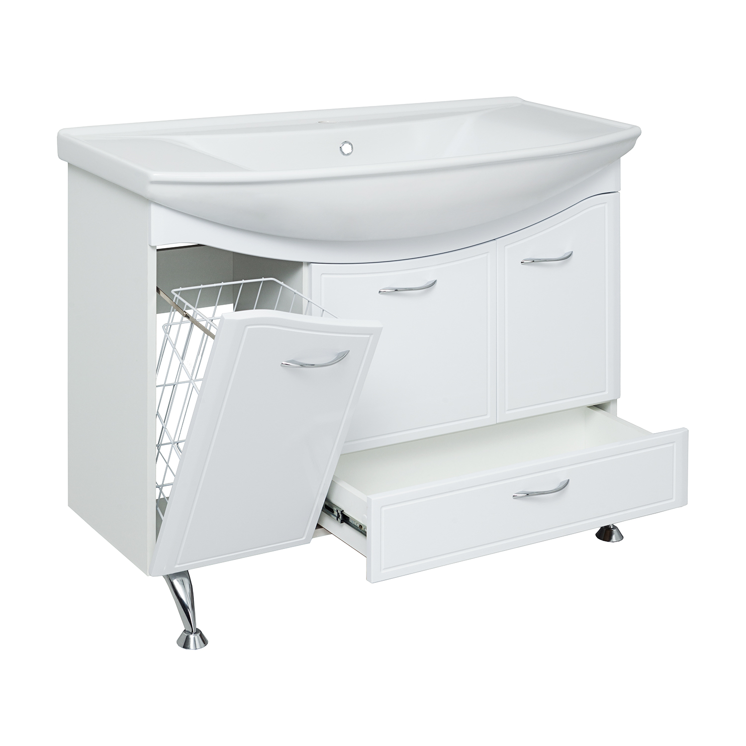 Тумба под умывальник напольная с двумя распашными фасадами, откидной дверкой посередине и нижним выдвижным ящиком. Фасад слева откидной и укомплектован встроенной корзиной для белья. Петли со встроенным доводчиком, ящик - на шариковых направляющих полного выдвижения, ручки - 4шт, ножки хром -2шт, ножки пластик - 2шт.