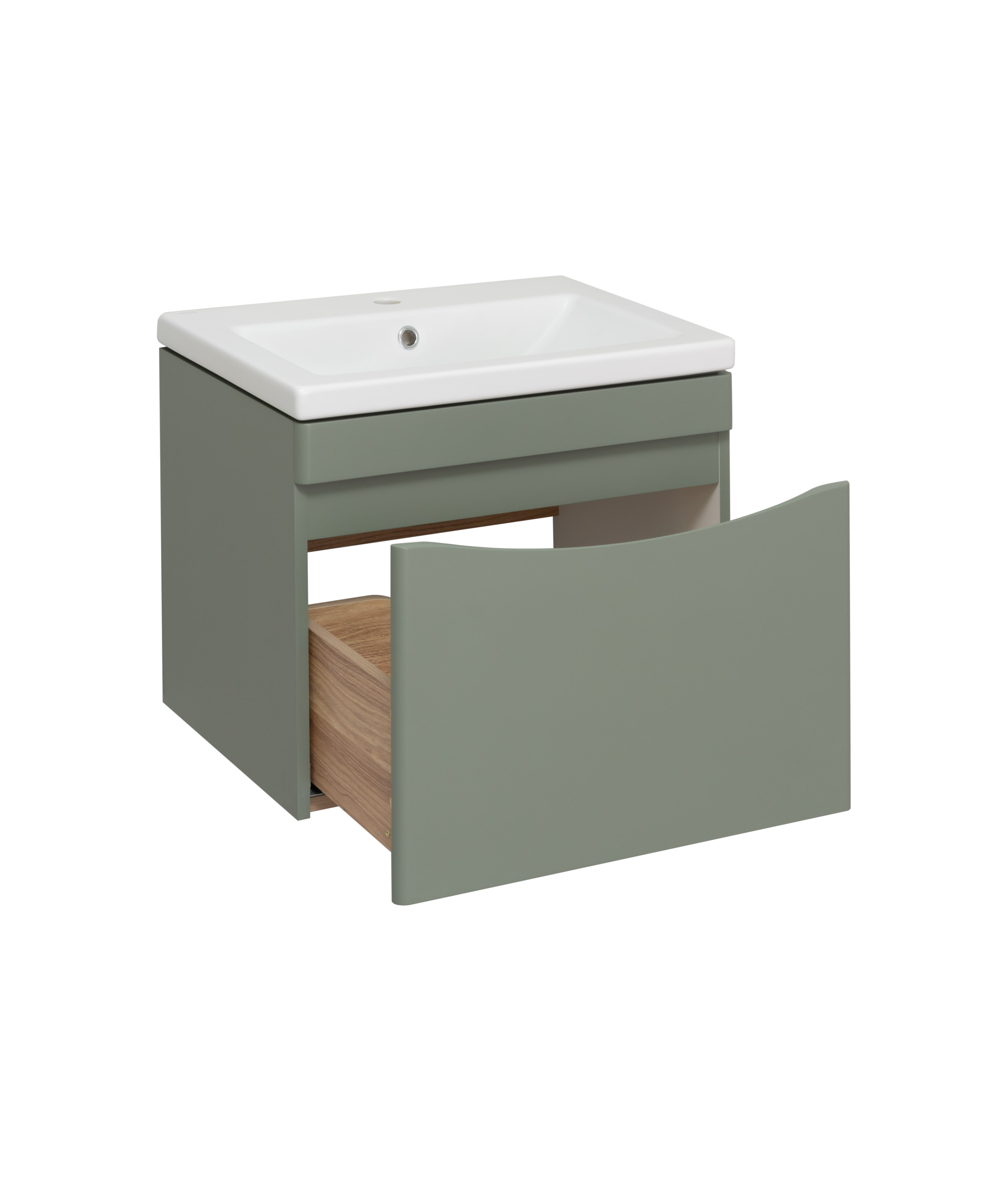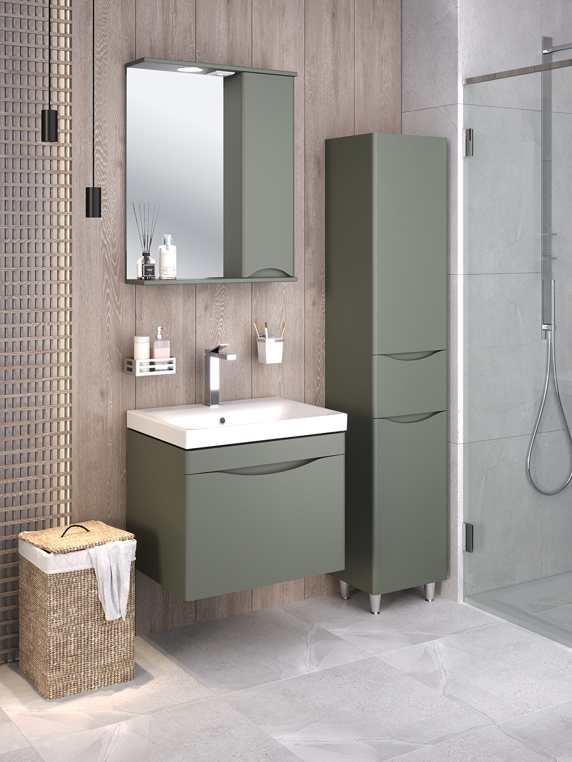 Тумба с раковиной для ванной комнаты RUNO АФИНА - безупречное сочетание модных тенденций с классическим оформлением ванной комнаты. Тумба под раковину в ванную АФИНА имеет два выдвижных ящика на шариковых направляющих, оснащенных системой плавного закрывания. Цвет фасада стильный - цемент, идеально впишется в интерьер ванной комнаты. В комплекте идут 2 хромированные и 2 пластиковые ножки. Тумба для ванной комнаты комплектуется накладной керамической раковиной "Moduo" (605х460 мм). Раковина имеет глубину 17,5 см. Мебель для ванной RUNO - красота и практичность в мелочах!