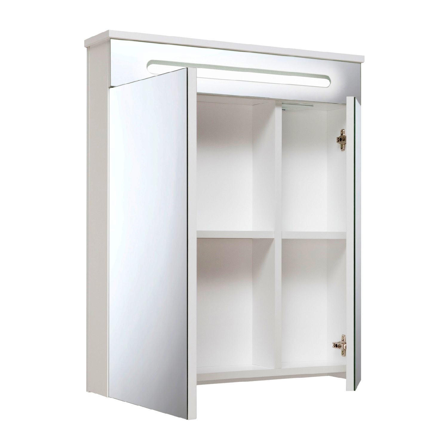 Зеркальный шкаф со встроенной сверху люминесцентной подсветкой и двумя отделениями с зеркальными фасадами. Внутри - две встроенные полки. Блок розетка/выключатель расположен внутри шкафа. Петли со встроенным доводчиком.