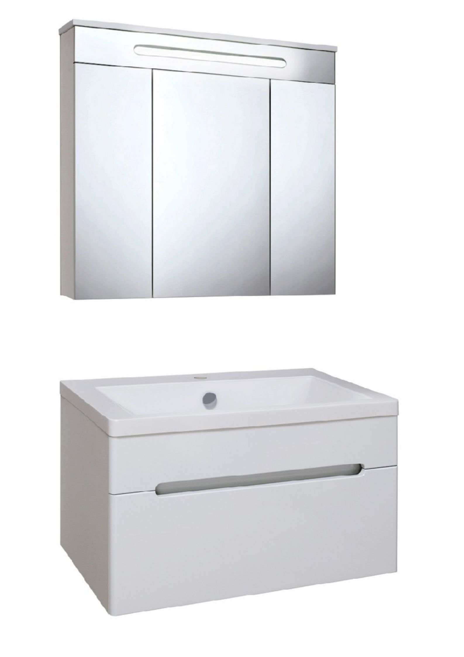 Зеркальный шкаф со встроенной сверху люминесцентной подсветкой и тремя отделениями с зеркальными фасадами. Внутри - две встроенные полки. Блок розетка/выключатель расположен внутри шкафа. Петли со встроенным доводчиком.