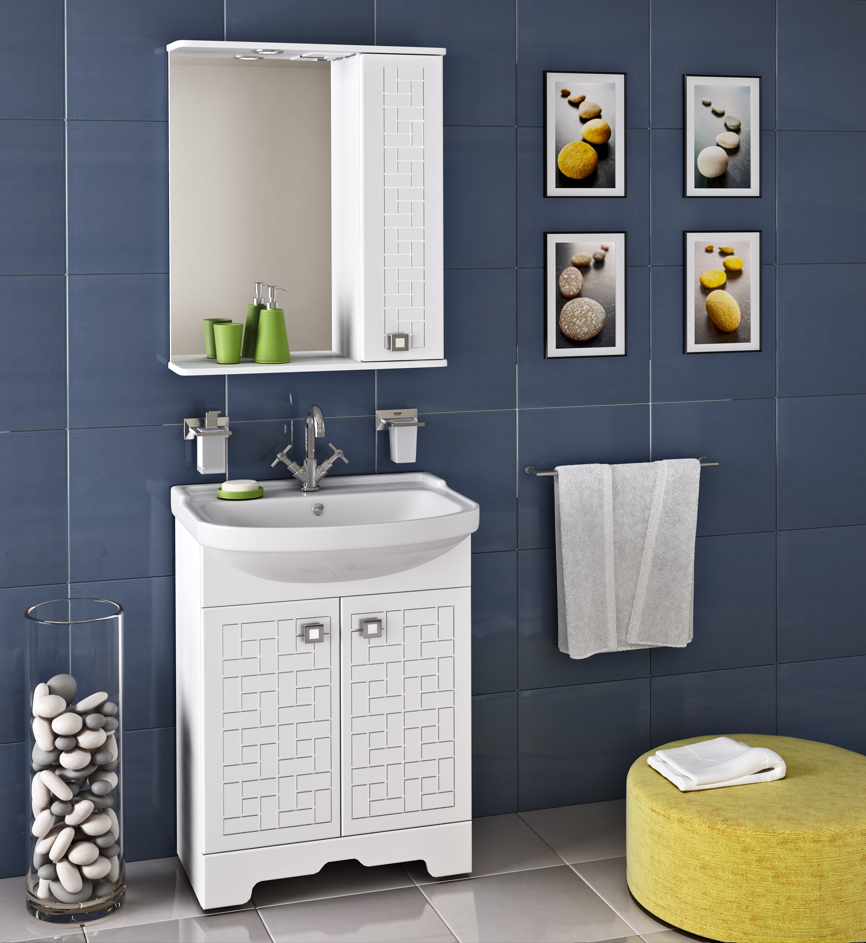 Зеркальный шкаф оборудован одним врезным светодиодным светильником 220В и розеткой с выключателем. Справа шкафчик с распашным фасадом, за которым две внутренние полки. Петли со встроенным доводчиком, ручка -1 шт. Выпускается только в правом исполнении.