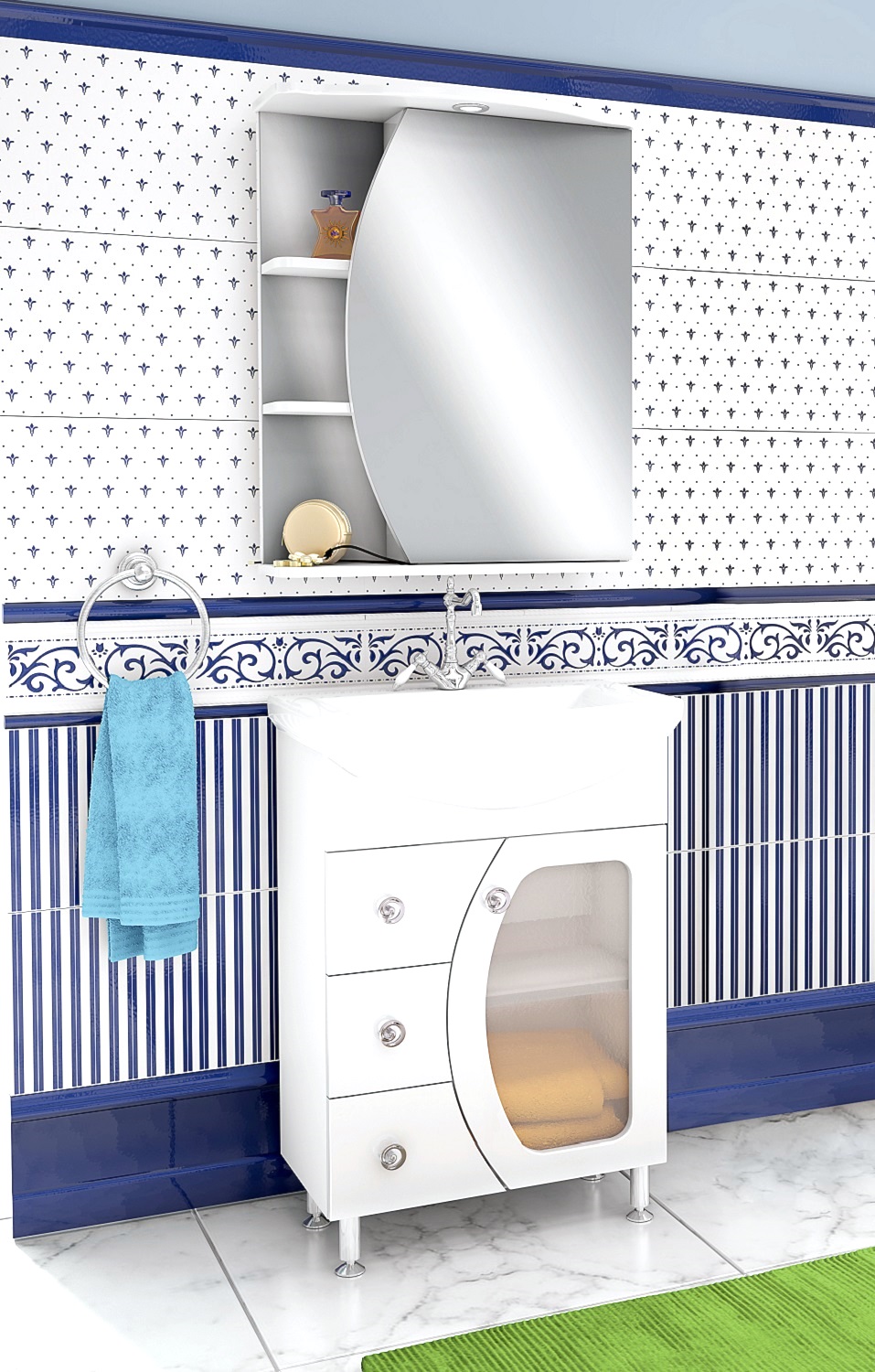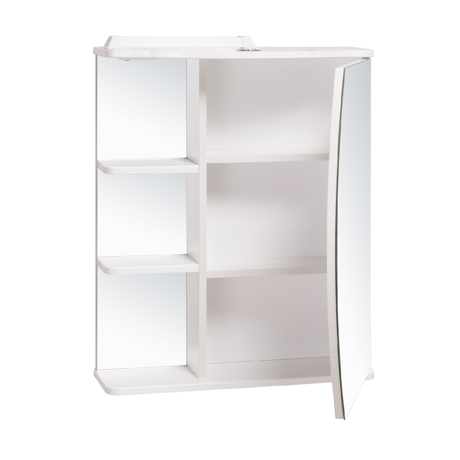 Зеркальный шкаф оборудован одним врезным светодиодным светильником 220В и розеткой с выключателем. Справа - шкаф с фигурной зеркальной дверцей и двумя внутренними полками, слева - две открытые полочки. Петли со встроенным доводчиком.