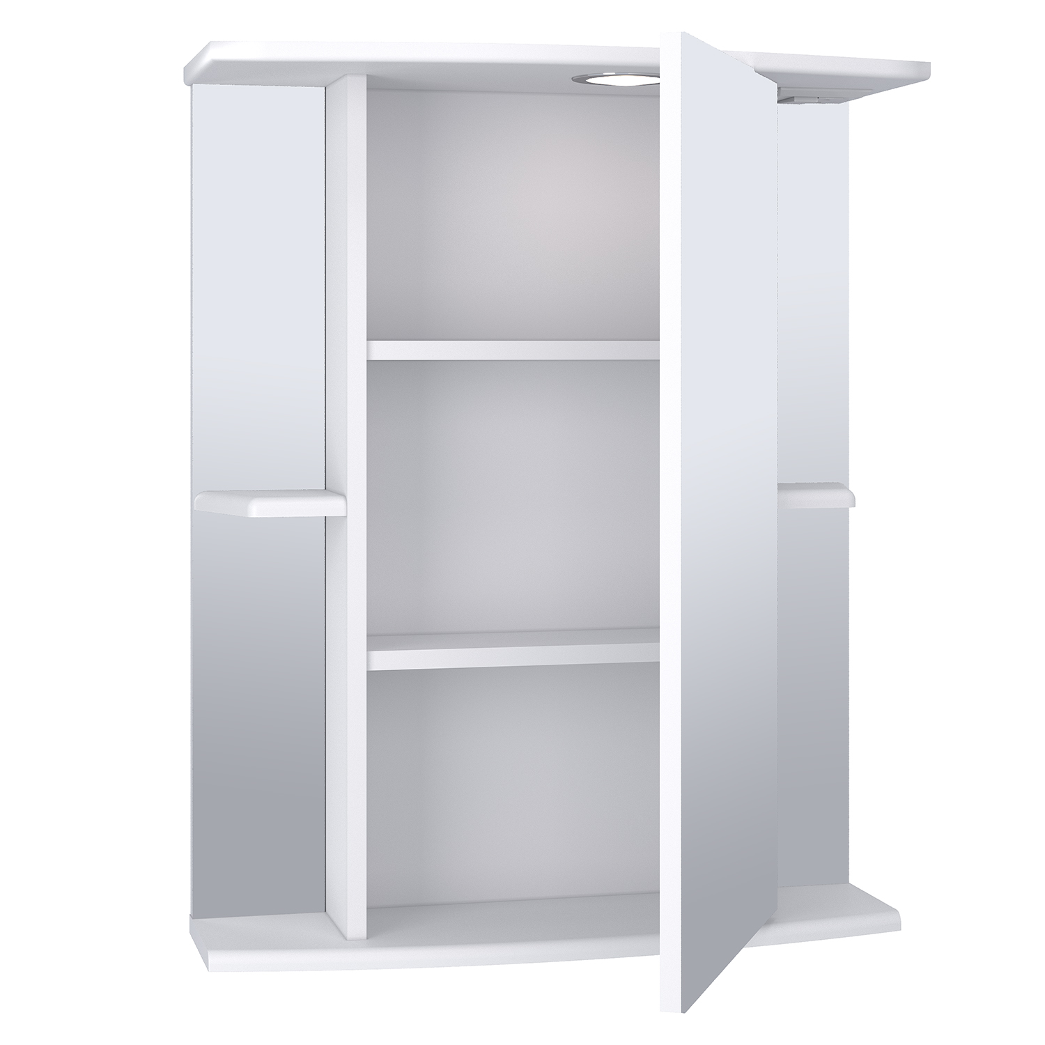 Зеркальный шкаф оборудован одним врезным светодиодным светильником 220В и розеткой с выключателем. По центру - шкаф с зеркальной дверцей и двумя внутренними полками, справа и слева -по одной открытой полочке. Петли со встроенным доводчиком. Выпускается только в правом исполнении.