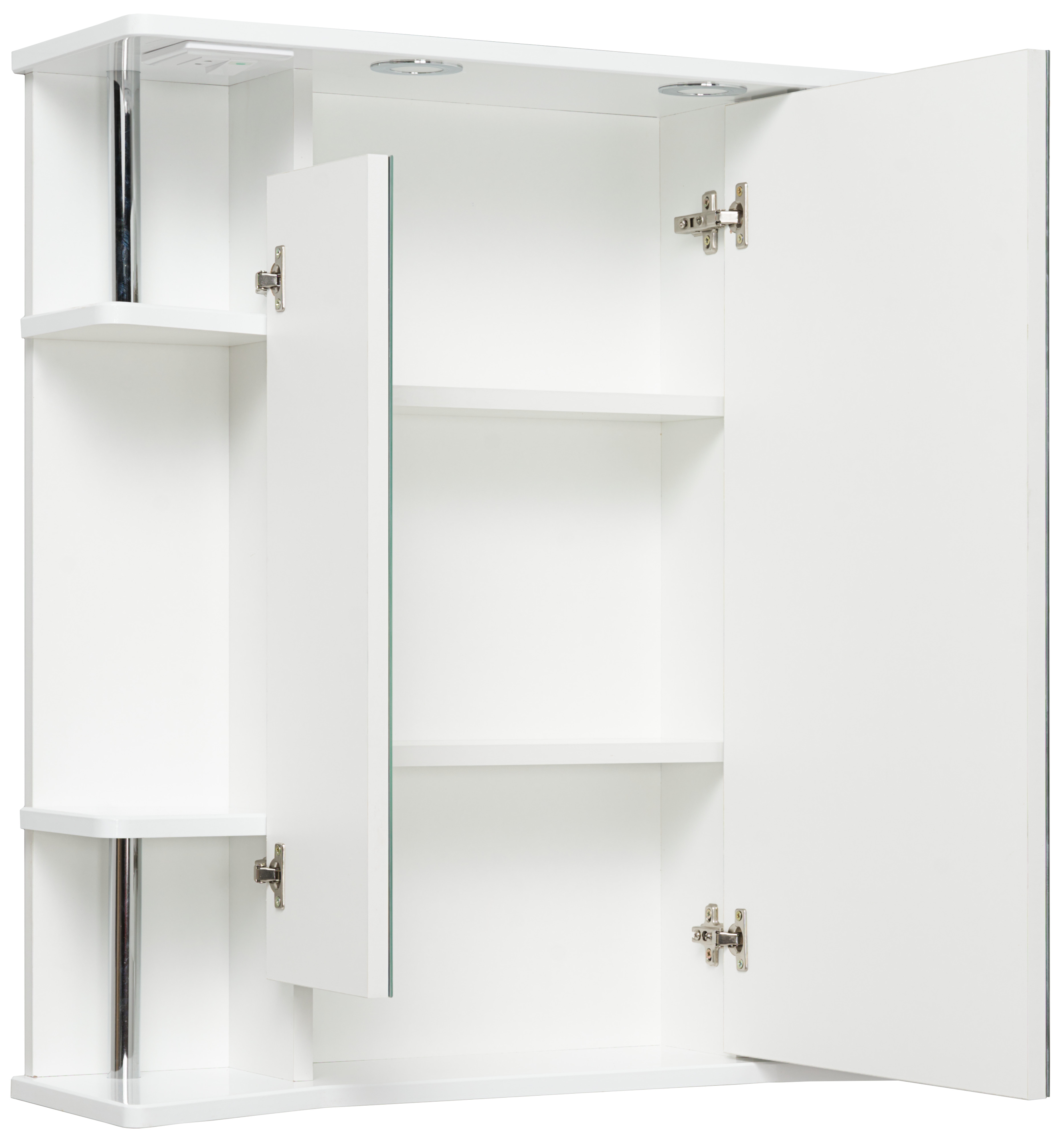 Зеркальный шкаф оборудован двумя светодиодными светильниками 220В, розеткой с выключателем. Шкаф в виде трельяжа, с тремя распашными зеркальными дверками, за каждой из которых находятся по две полки. Петли со встроенным доводчиком.