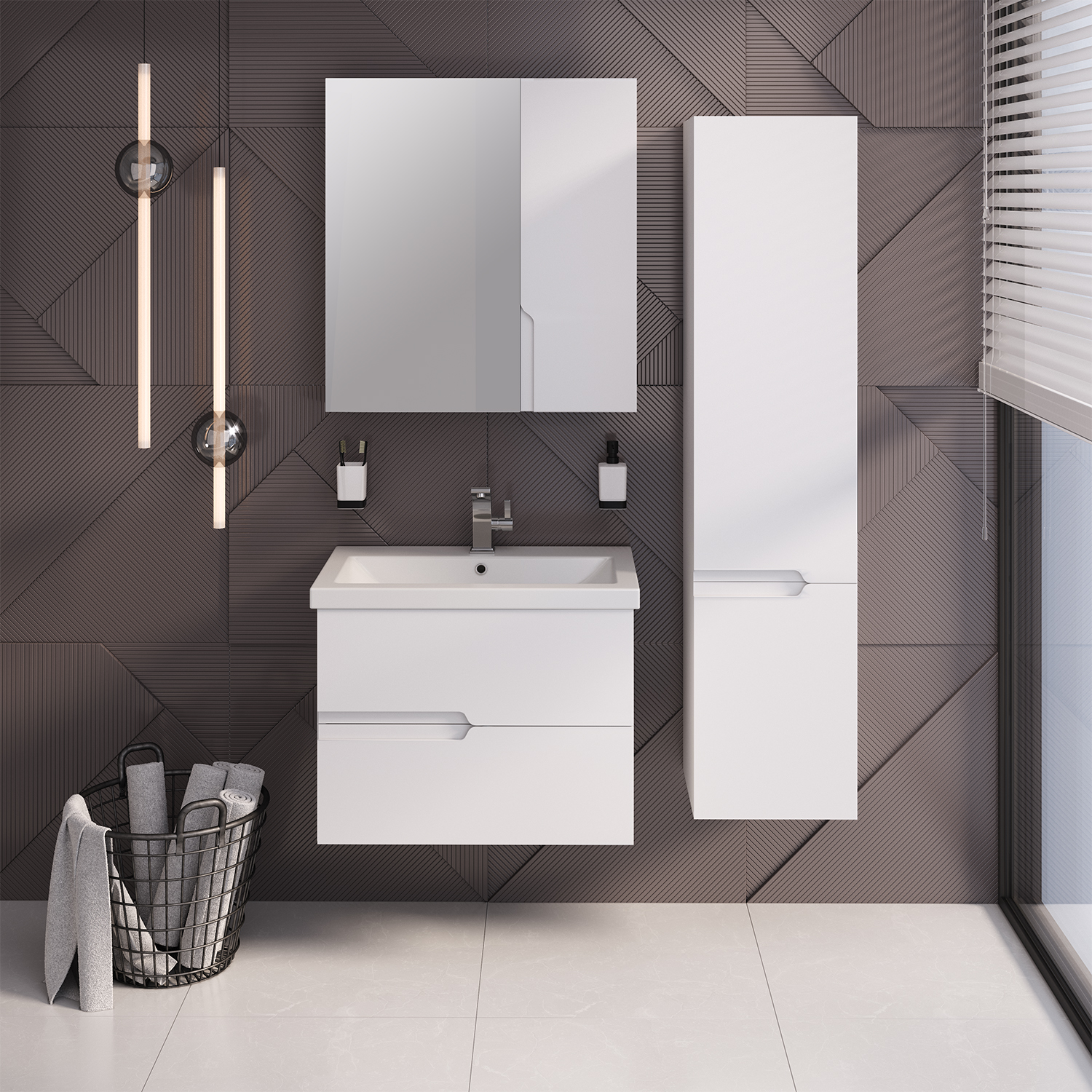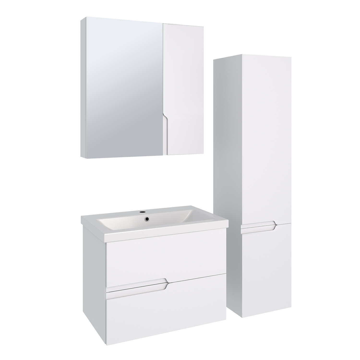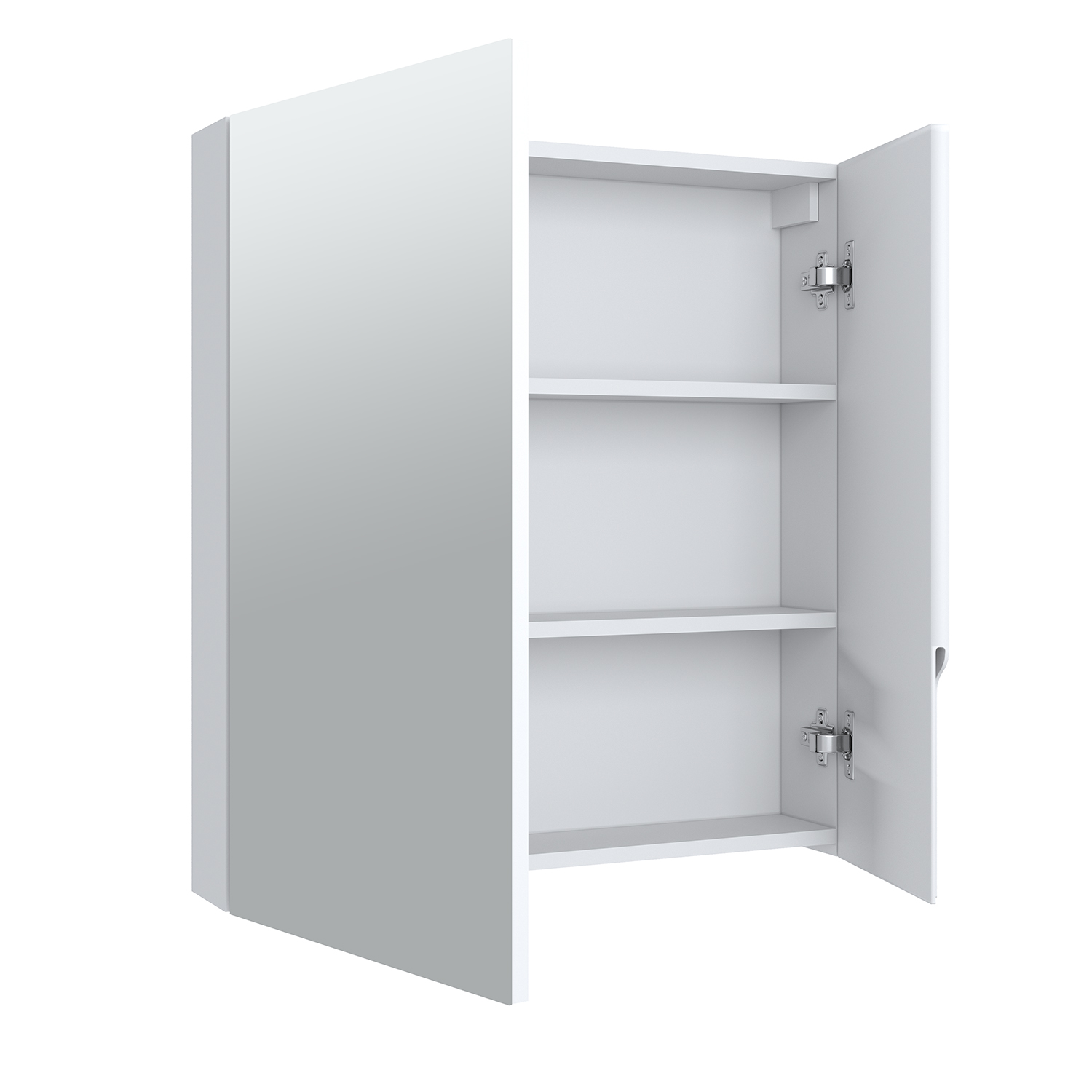 Зеркальный шкаф без подсветки c двумя ассиметричными дверками, одна из которых зеркальная, а вторая - белая. Внутри шкафа - две горизонтальные полки. Петли со встроенным доводчиком.