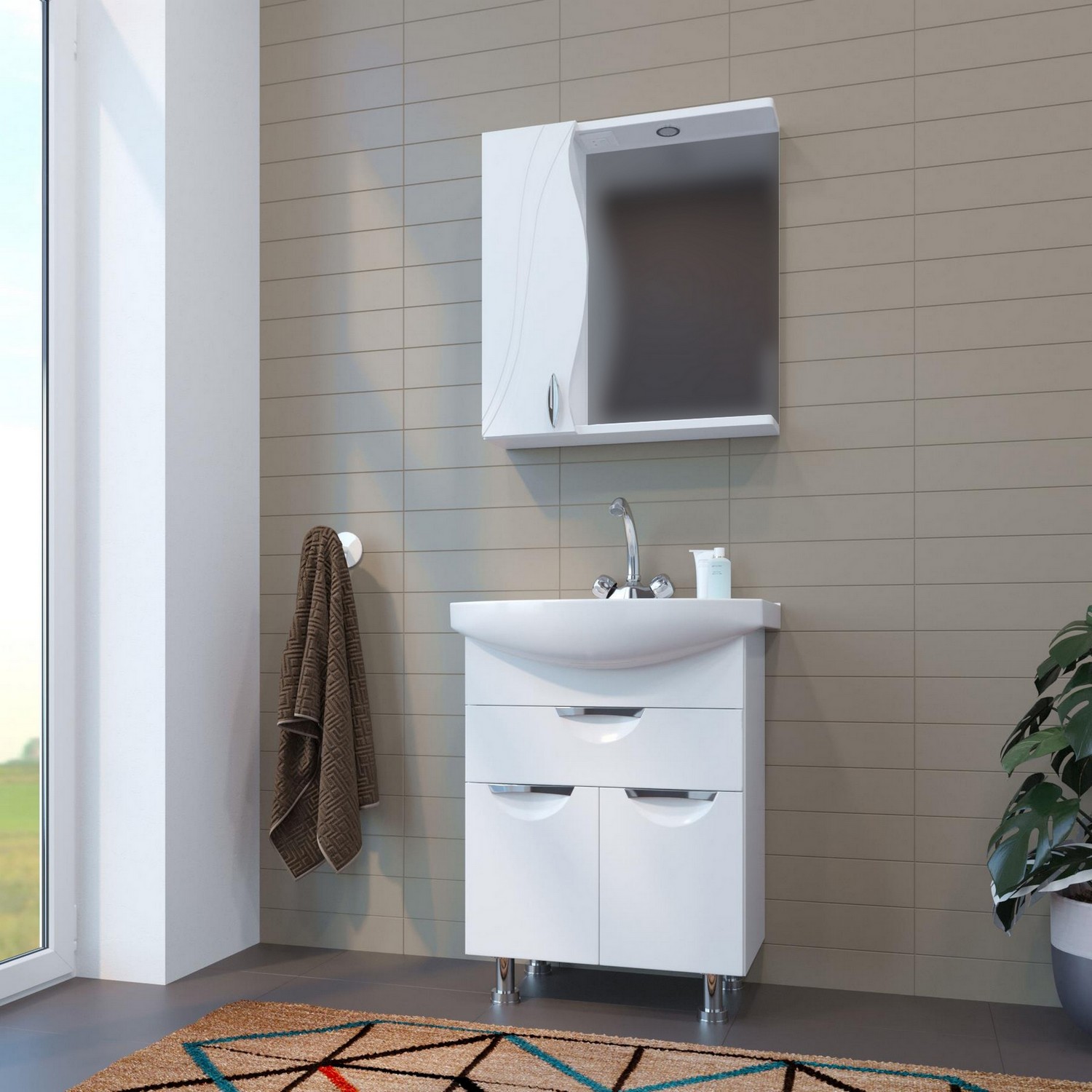 Комплект мебели предназначен для небольших ванных комнат. Изящные вьющиеся линии, украшающие фасады мебели, придадут ванной легкость, а тщательно продуманная конструкция и организация внутреннего пространства позволяет навести порядок даже в небольшой ванной комнате.