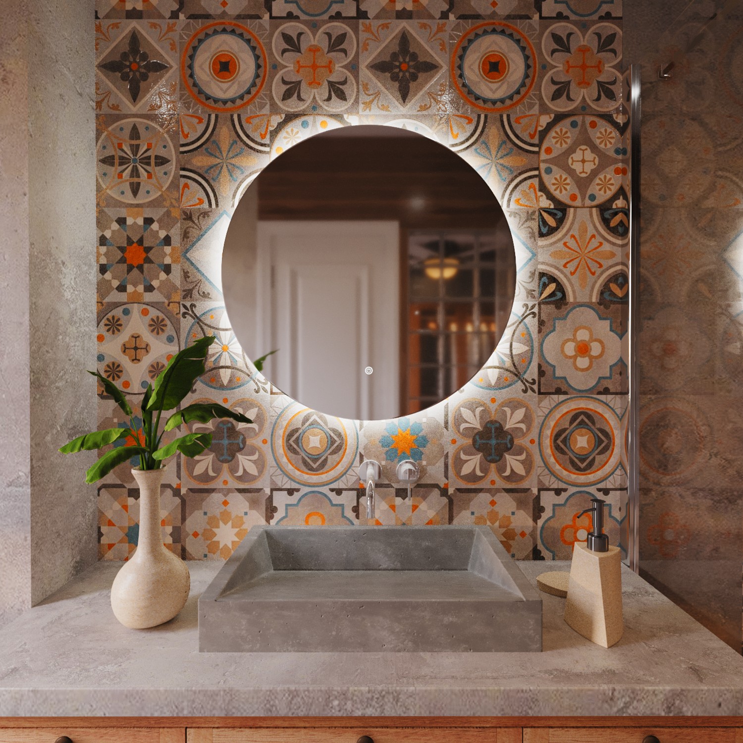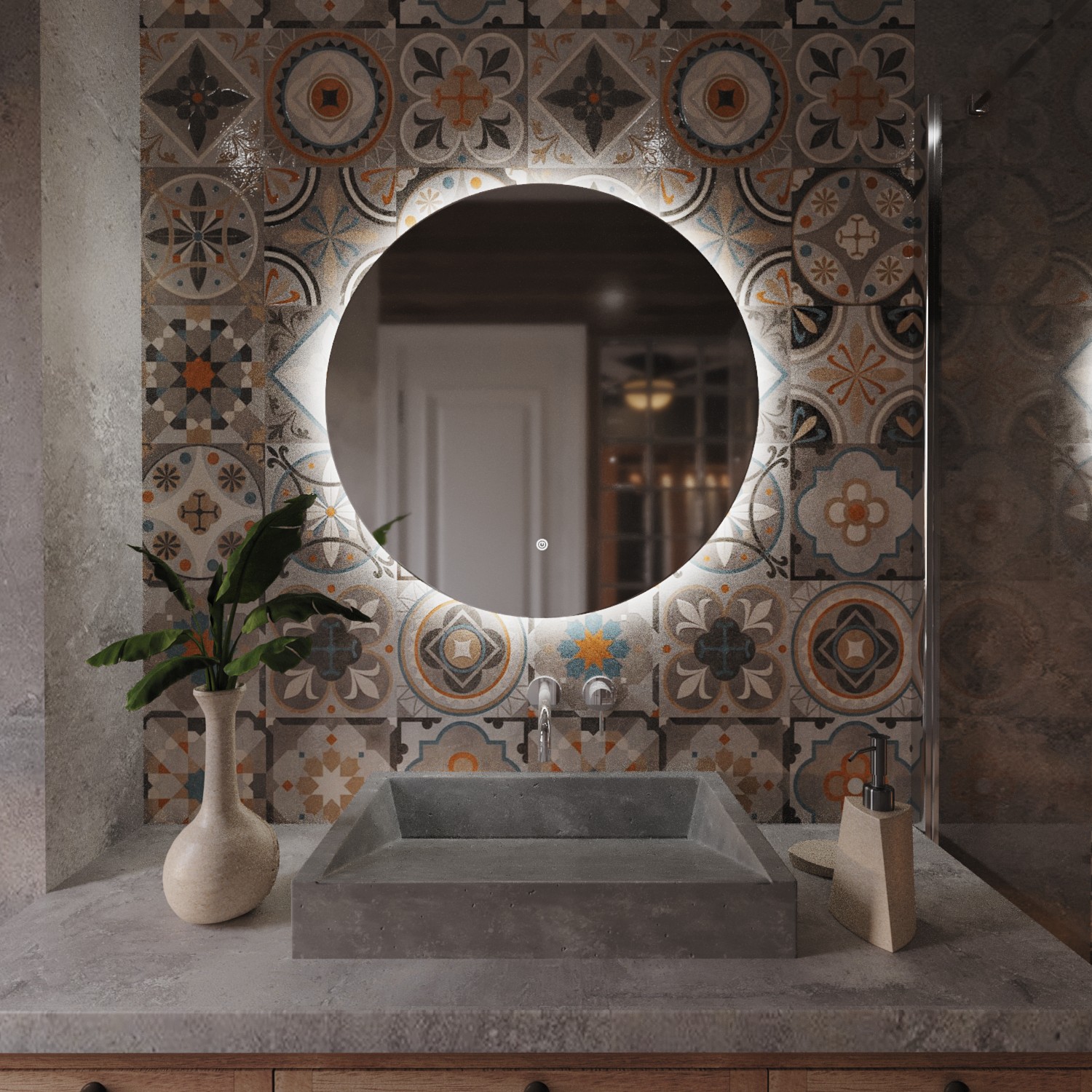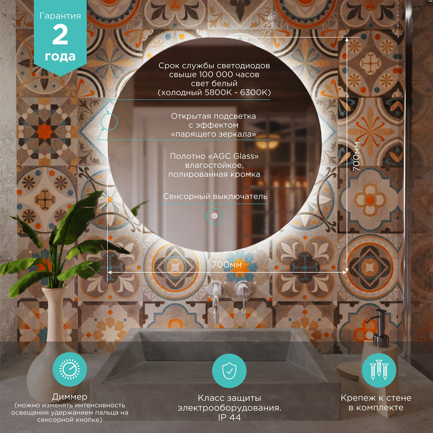 Настенное зеркало для ванной Mixline с подсветкой D70 см изготовлено из зеркального полотна толщиной 4 мм. Оснащено сенсорным выключателем и диммером, который при удержании пальца на сенсоре позволяет менять интенсивность освещения.