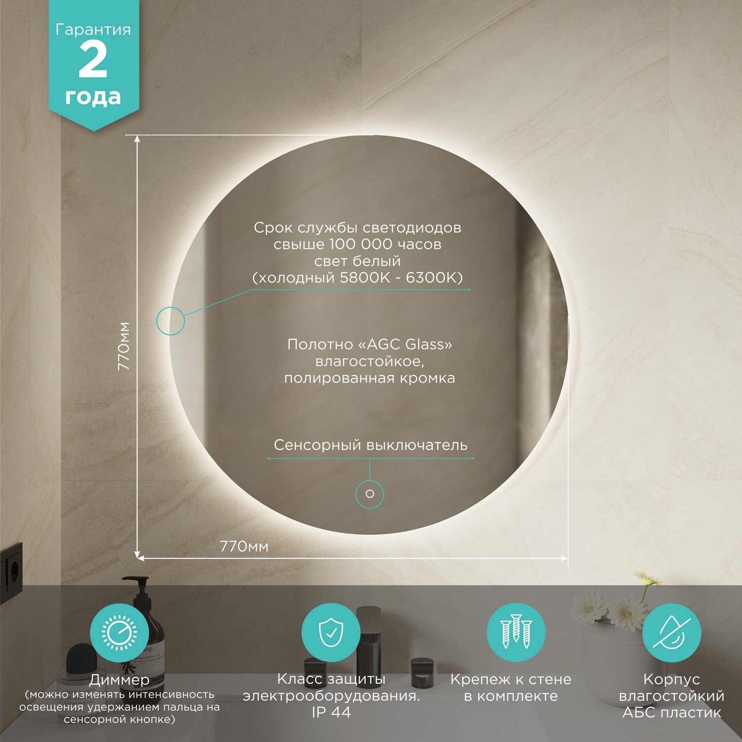 Круглое зеркало MIXLINE "Саванна" с простой геометрией смотрится изыскано благодаря имеющейся подсветке по периметру. В качестве элемента подсветки используется светодиодная лента. Зеркало оснащено сенсорным выключателем и диммером, который при удержании пальца на сенсоре позволяет менять интенсивность освещения.