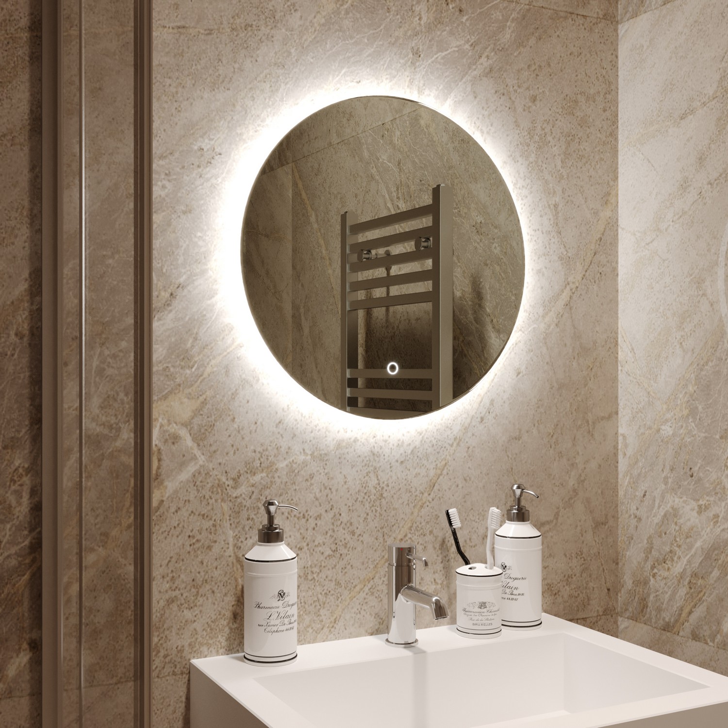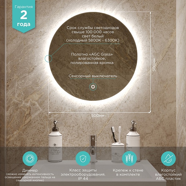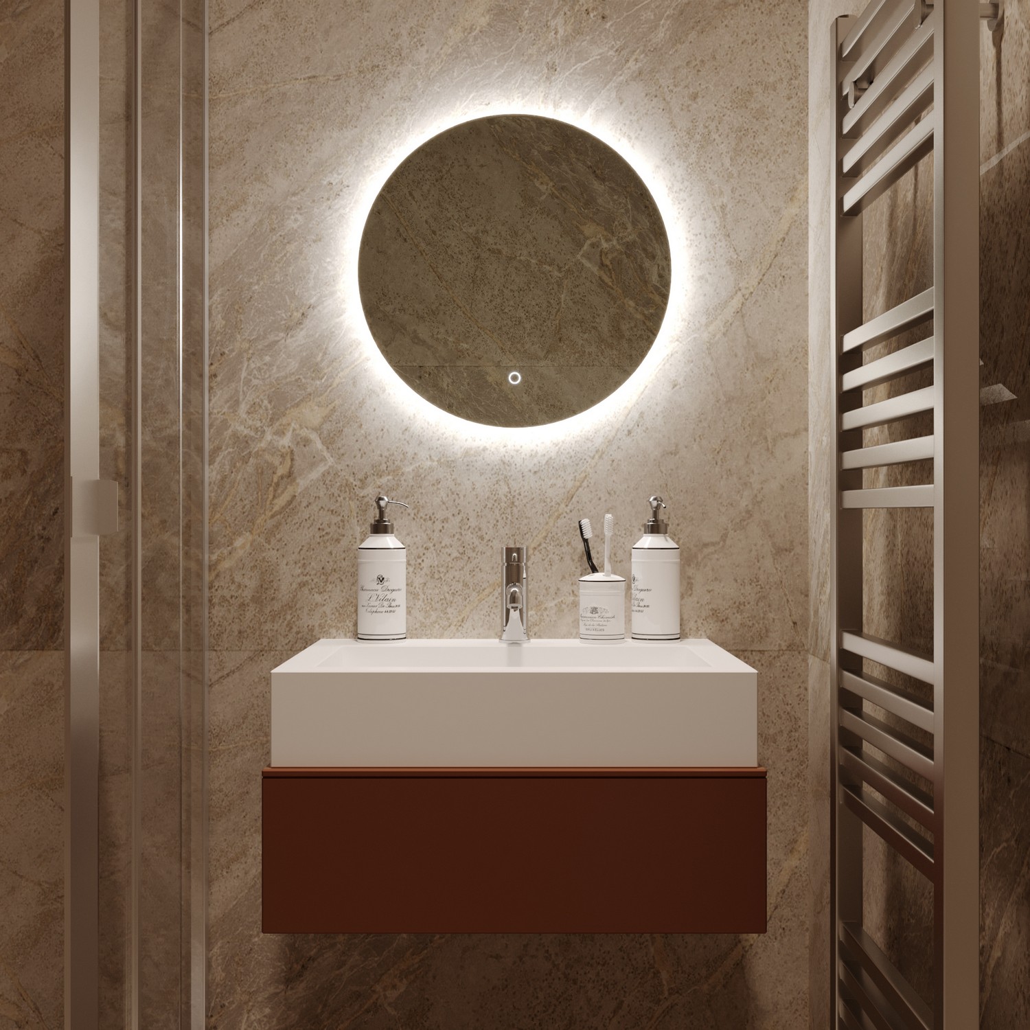 Круглое зеркало MIXLINE "Саванна" с простой геометрией смотрится изыскано благодаря имеющейся подсветке по периметру. В качестве элемента подсветки используется светодиодная лента. Зеркало оснащено сенсорным выключателем и диммером, который при удержании пальца на сенсоре позволяет менять интенсивность освещения.