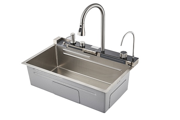 Модель оснащена панелью со смесителем и дисплеем, водопадом, краном для питьевой воды и ополаскивателем стакана.