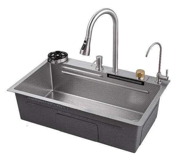 Модель оснащена панелью со смесителем, водопадом, краном для питьевой воды и ополаскивателем стакана.