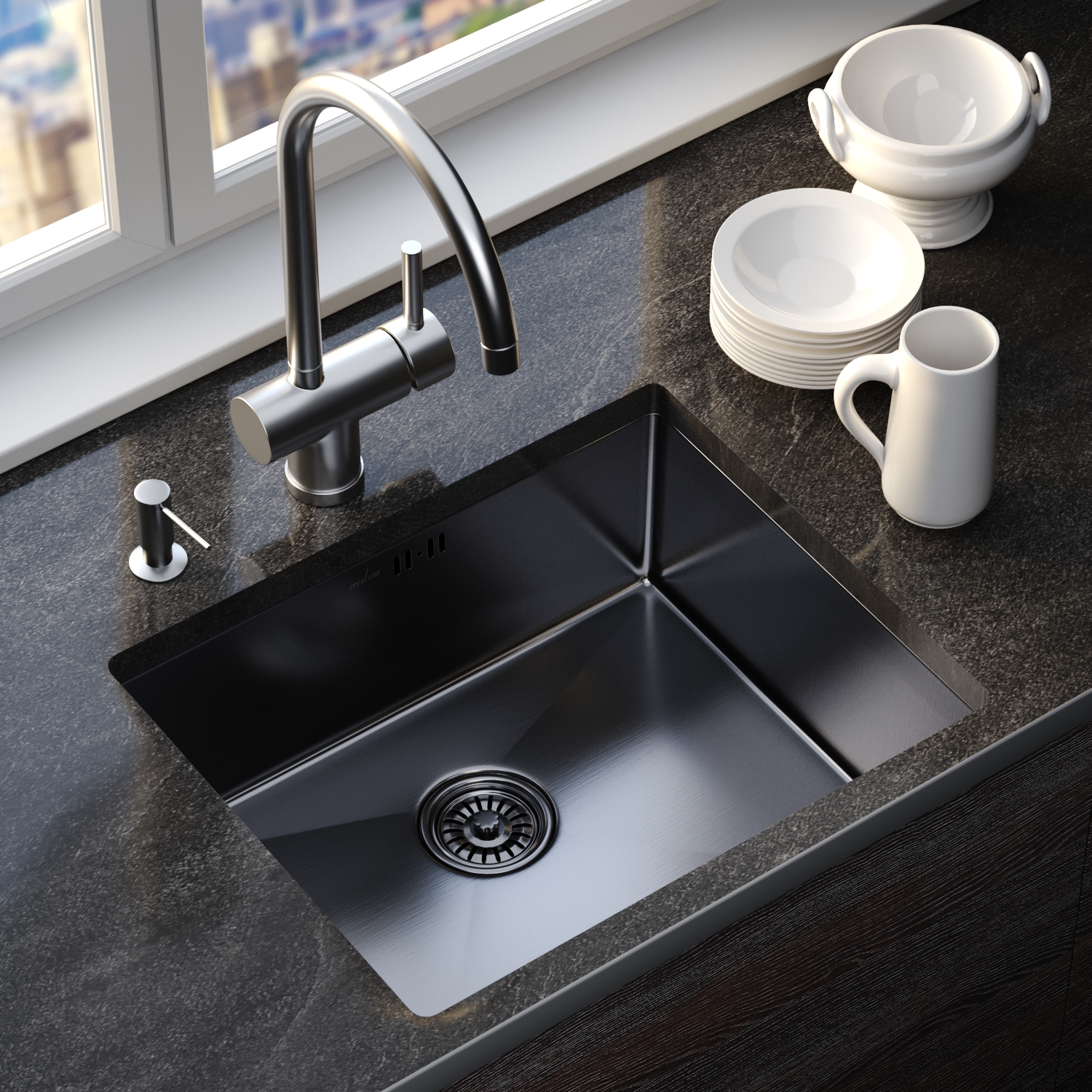 Мойка MIXLINE подстольный монтаж 53х43 (3,0) вып 3 1/2, 22см с сифоном черный графит PRO (547232)