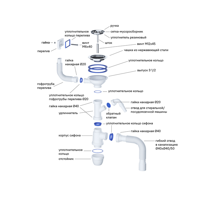 • Сифон с отдельным отводом для стиральной/посудомоечной машины с обратным клапаном и гофрированными отводами для удобства подключения.