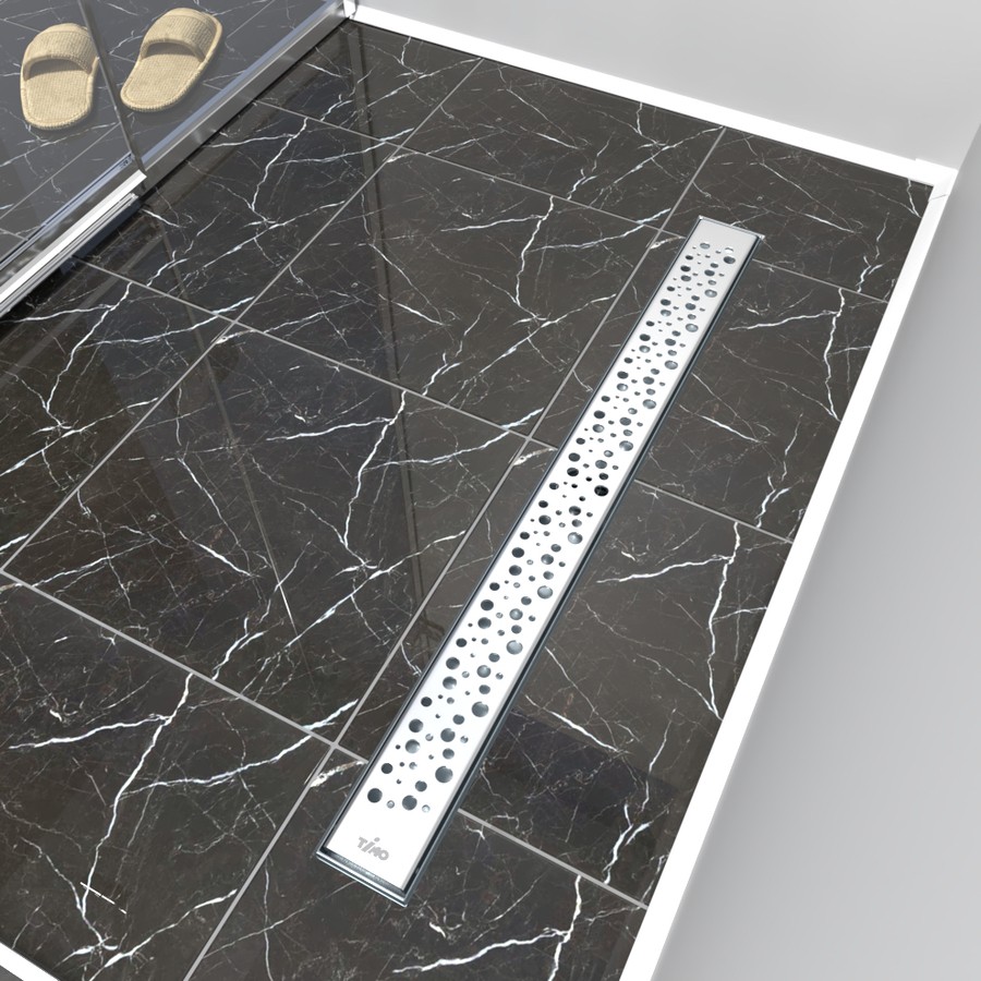 водоотводящий желоб из нержавеющей стали; декоративная панель "lines"; заглушка монтажная; поворотный сифон DN50, выход вбок; комплект регулируемых опор; стакан с мембраной; улавливатель волос и мусора; гидроизоляционная лента; сервисный ключ