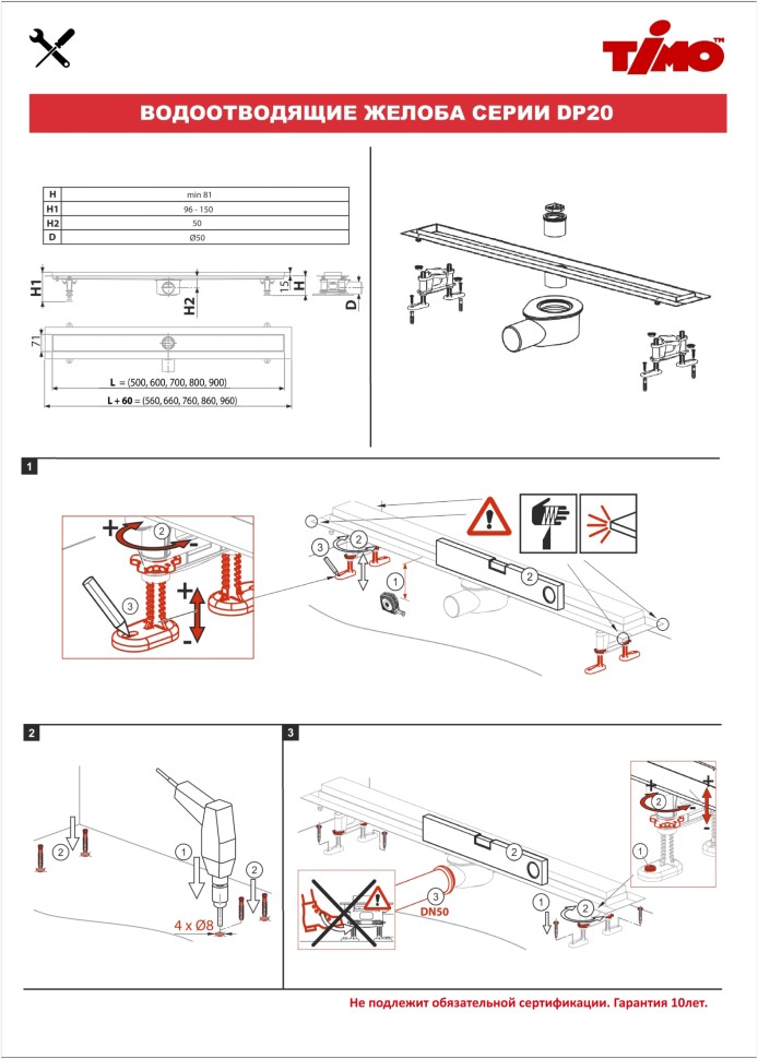 водоотводящий желоб из нержавеющей стали; декоративная панель "lines"; заглушка монтажная; поворотный сифон DN50, выход вбок; комплект регулируемых опор; стакан с мембраной; улавливатель волос и мусора; гидроизоляционная лента; сервисный ключ