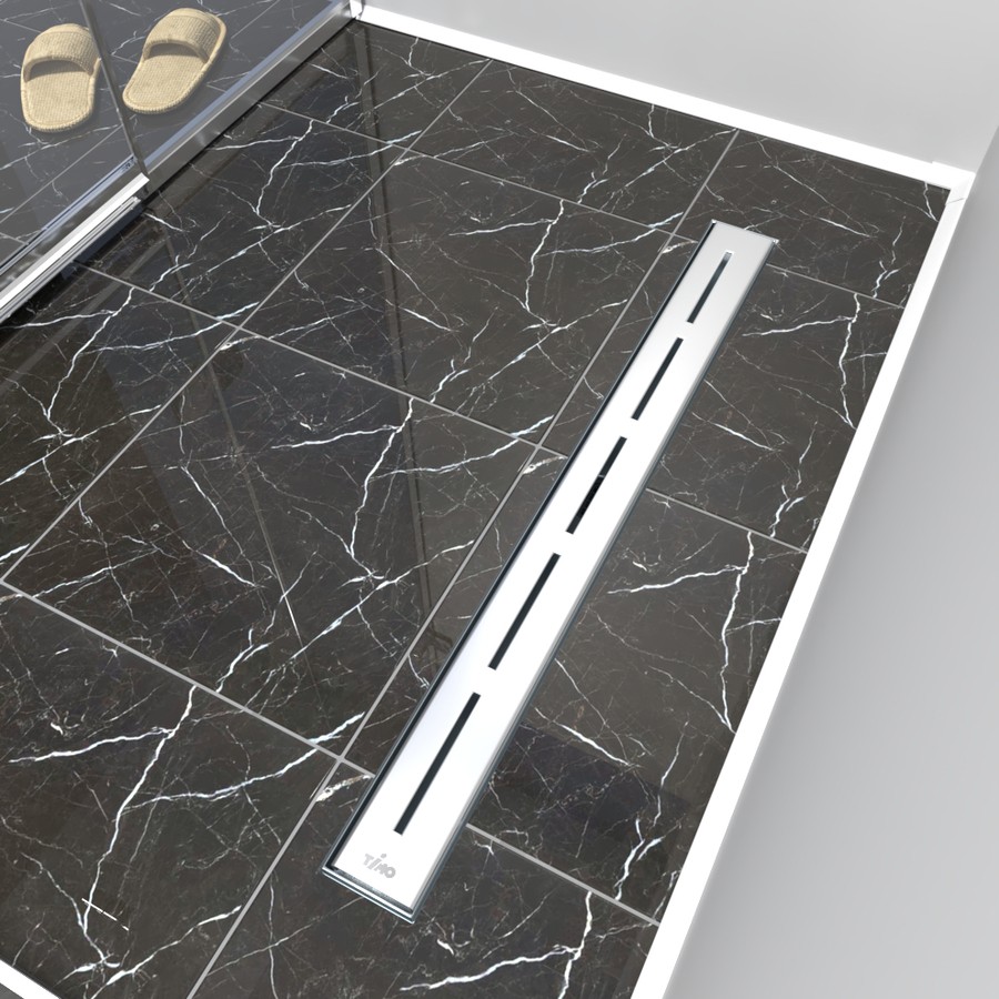 водоотводящий желоб из нержавеющей стали; декоративная панель "lines"; заглушка монтажная; поворотный сифон DN50, выход вбок; комплект регулируемых опор; стакан с мембраной; улавливатель волос и мусора; гидроизоляционная лента; сервисный ключ
