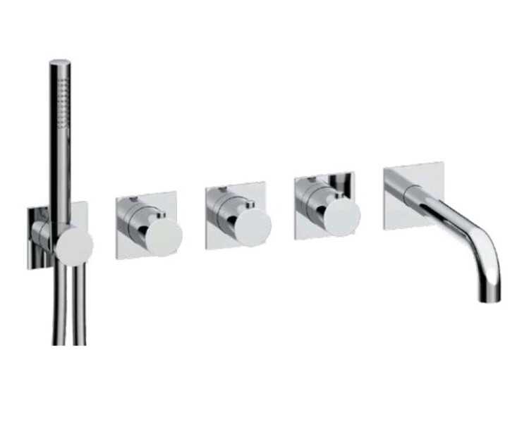 Смеситель для ванны и душа, Almar, на 2 потребителя, тип открывания воды-вентильный, тип регулирования воды-термостатический картридж, монтаж-настенный встраиваемый, отверстия для монтажа-5, вынос излива, мм-212-242, тип излива-неподвижный, ручной душ-в комплекте, розетки-квадрат, внутренняя часть-необходимо заказать, цвет-хром