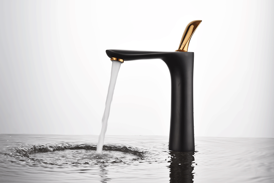 Правильная геометрия, идеальный пример минимализма и современного дизайна в ярком сочетании черного и золотого цветов для ванной комнаты.