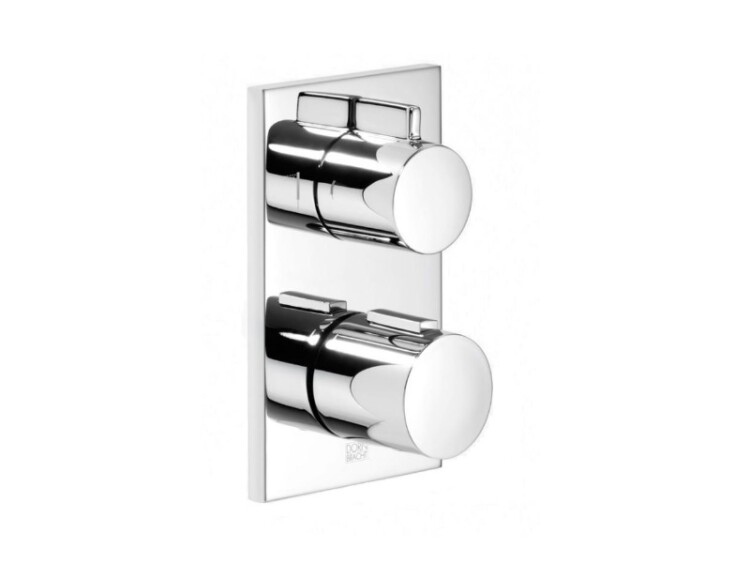 Смеситель для душа, Dornbracht, тип открывания воды-двухвентильный, тип регулирования воды-термостатический картридж, тип установки-встраиваемый, отверстия для монтажа-2, внутренняя часть-необходимо заказать, цвет-хром, без регулирования расхода, в комплекте-2x втулка с переходником с возможностью укорочения, гидрораспределитель и контроль объема подачи воды с керамическими шайбами, накладная панель,мм-150*90, ручка с рычагом, ручка со шкалой и стопором на 38°, ограничитель температуры горячей воды, предварительно настраиваемый