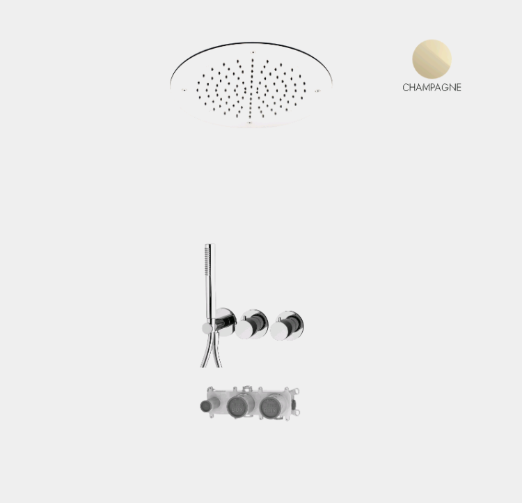 Душевой комплект, Fima Carlo Frattini, смеситель-в комплекте, на 2 потребителя, монтаж смесителя-настенный встраиваемый, тип открывания воды-однорычажный, тип регулирования воды-термостатический картридж, внутренняя часть-в комплекте, верхний душ-есть, форма верхнего душа-круглая, размер верхнего душа,мм-500*500, ручной душ с защитой от извести анти-кальк-в комплекте, гибкий шланг хромалюкс-есть, размер шланга, мм-1500, держатель для ручного душа-есть, шланговое подключение-есть, внутренняя часть-в комплекте, цвет-шампань