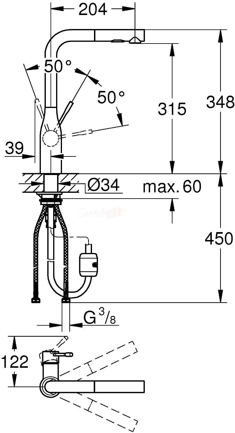 Угол поворота излива:360 °