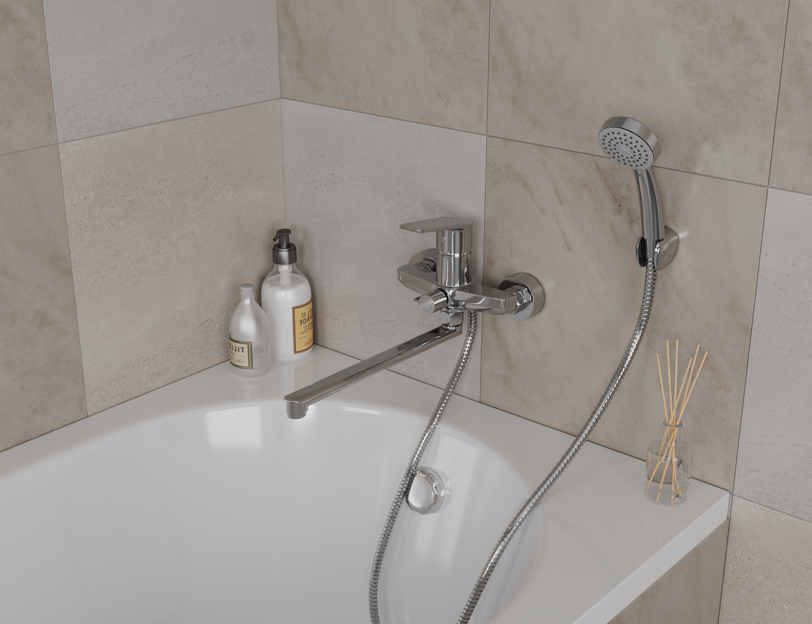 В комплекте универсальная присоединительная группа для установки на вертикальную поверхность, однорежимная душевая лейка и душевой шланг длиной 1,5м., держатель душевой лейки, эксцентрики фум-лента, индивидуальный пакет, паспорт, гарантийный талон.