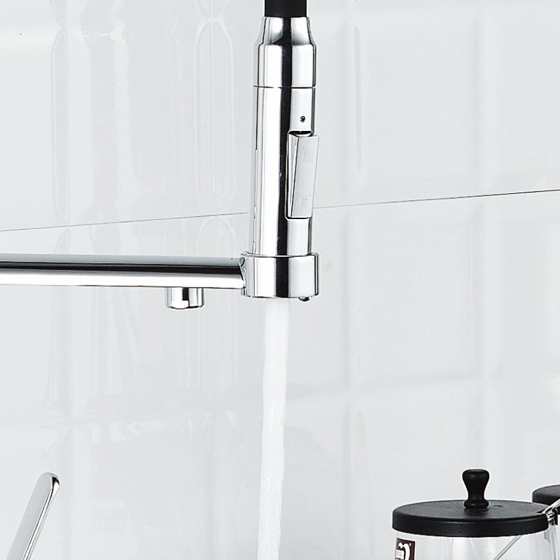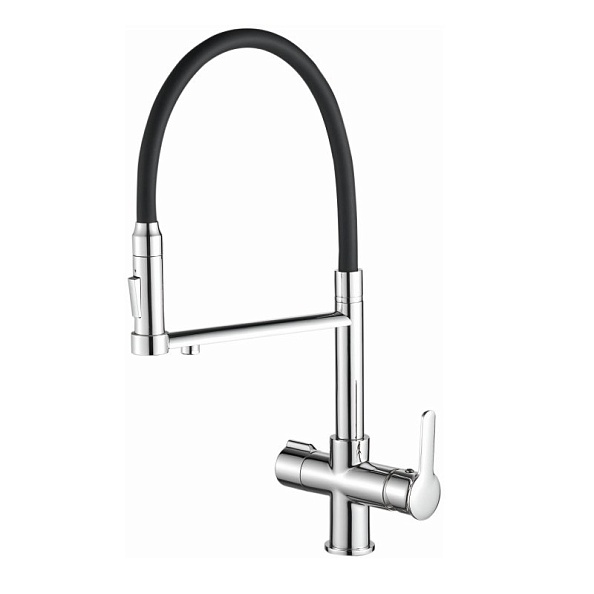 Смеситель для кухни бренда Haiba. Изготовлен из латуни. Картридж 35 мм. Укомплектован аэратором. Гибкая подводка 40 см. С поворотным гибким изливом. На изливе размещена кнопка для переключения в режим "душ".