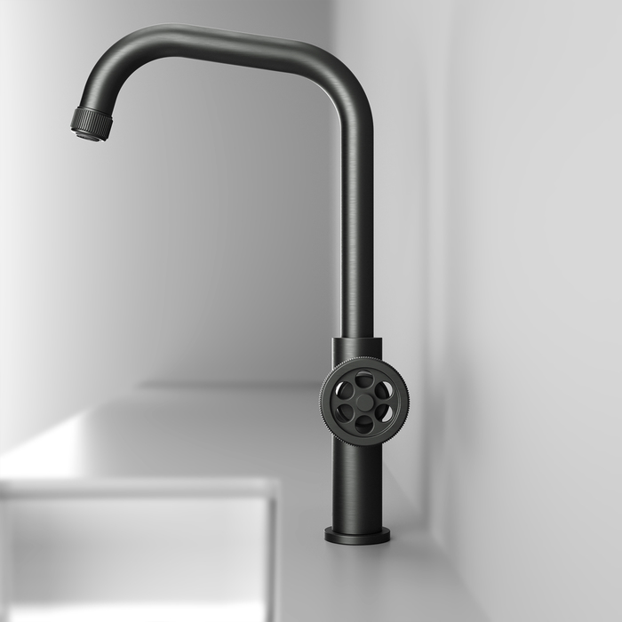 Однозахватный смеситель для кухни Grange в стильном оттенке графит имеет запоминающийся дизайн и яркие, неординарные детали. Круглая дизайнерская ручка красиво, оригинально выглядит и удобно поворачивается даже мыльной рукой. Такой смеситель прекрасно дополнит интерьер в трендовом стиле лофт и может быть установлен как на мойку, так и на столешницу.