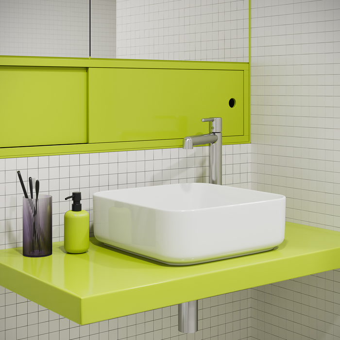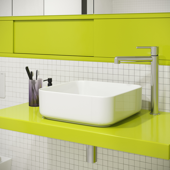Стильный высокий смеситель для настольного умывальника удачно сочетает актуальный современный дизайн и классический цвет хрома. Тонкая удлиненная ручка добавляет смесителю изящества и комфорт в управлении. Расстояние между ручкой и изливом увеличено для большего удобства.