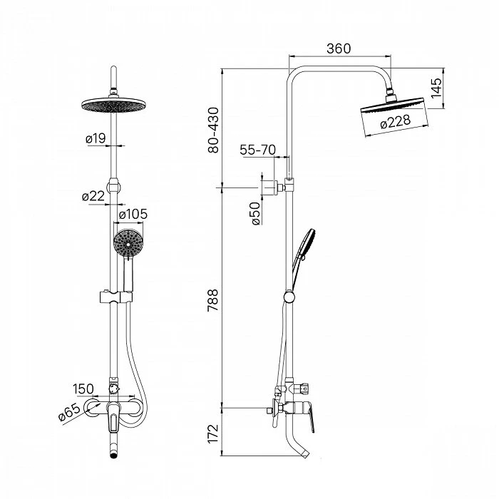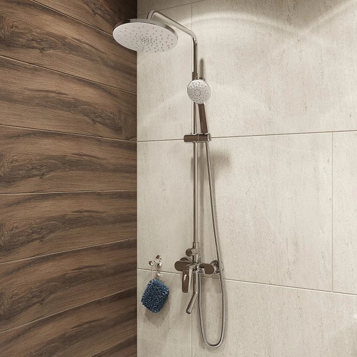 Смеситель для ванны с верхним душем, латунь, цвет - хром, керамический картридж Softap 35 мм, силиконовый аэратор Neoperl; верхняя лейка с функцией самоочистики - 1 режим, диаметр 228мм, ABS-пластик; ручная лейка - 3 режима, диаметр 105 мм, ABS-пластик; держатель для ручной лейки - ABS-пластик; 3-х режимный керамический дивертор; шланг из ПВХ в оплетке из нержавеющей стали - 1,5 м; телескопическая душевая стойка с регулировкой по высоте 868 - 1218 мм. Упаковка: кортонная коробка.