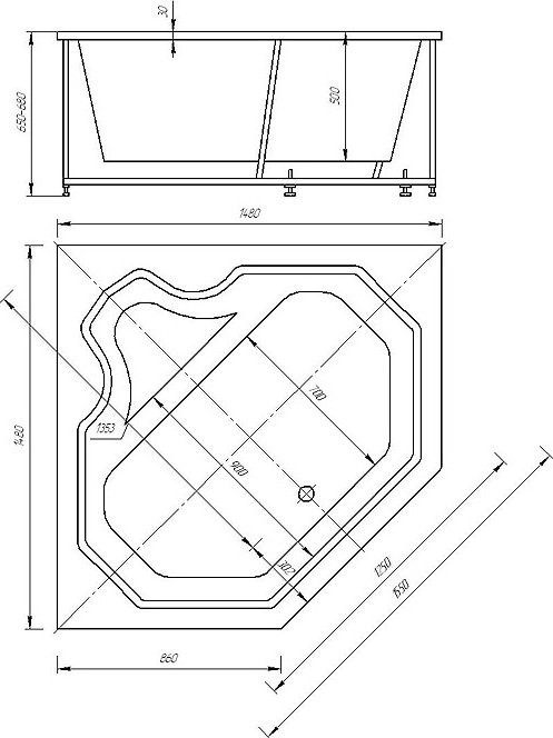 Акриловая ванна Aquatek Лира 1480x1480 без фронтального экрана, вклеенный каркас (LIR150-0000011)