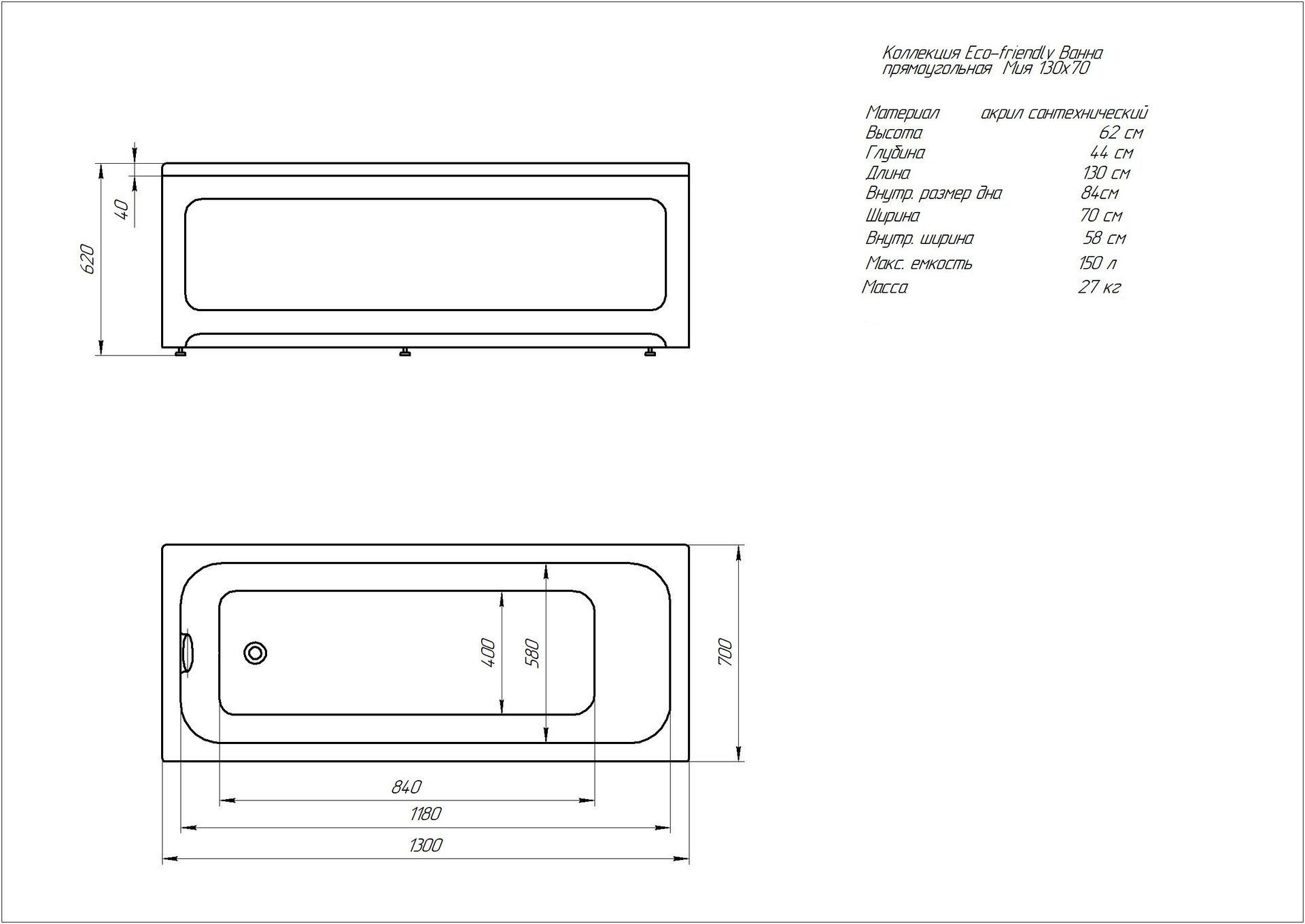 Акриловая ванна Aquatek Мия 1300х700 (MIY130-0000001)