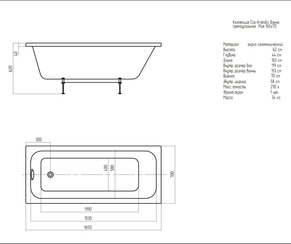 Акриловая ванна Aquatek Мия 1650x700 (MIY165-0000001)
