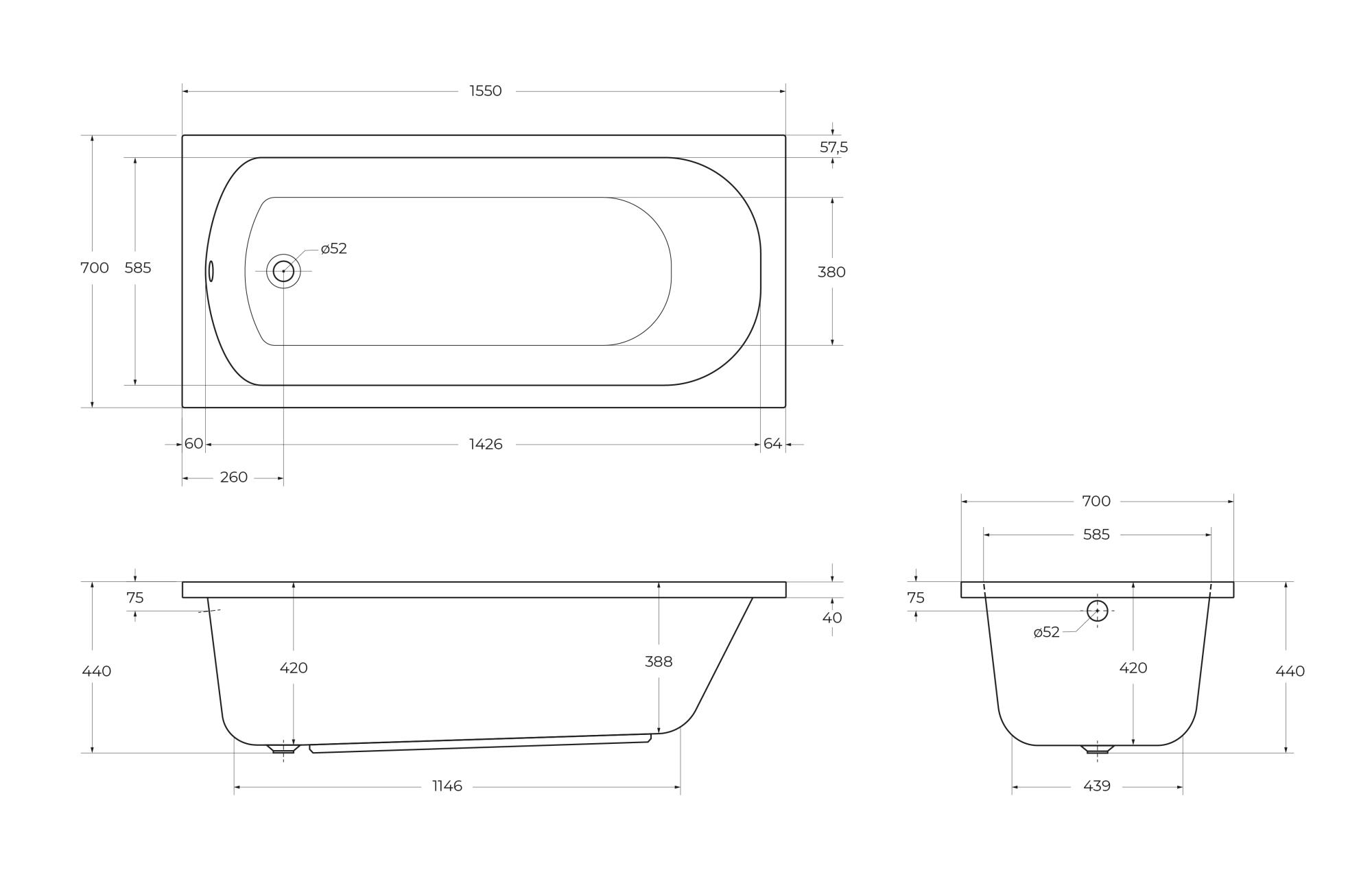 Акриловая ванна Cezares Eco 155х70, Белый (ECO-155-70-41-W37)