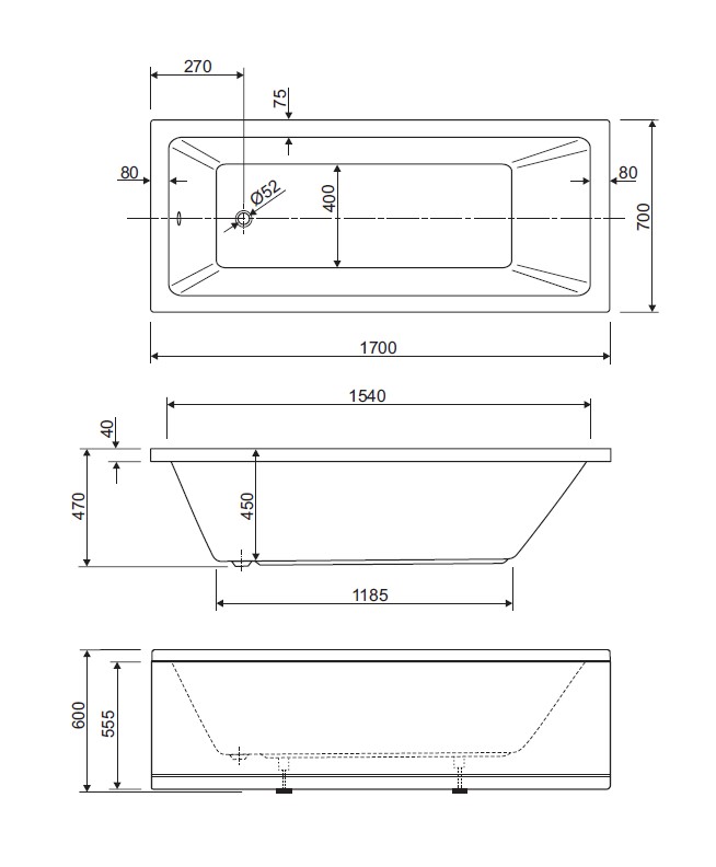 Акриловая ванна Cezares Plane solo 170х70, Белый (PLANE SOLO-170-70-45-W37) Слив-перелив: приобретается отдельно
