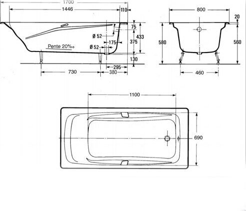 Ванна чугунная Jacob Delafon Repos (170x80 см) без отверстий для ручек, без антискользящего покрытия (E2918-S-00)