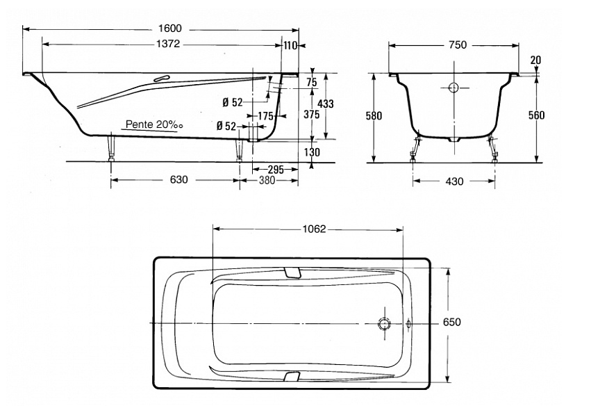 Ванна чугунная Jacob Delafon Repos (E2929-00) (160x75 см) с отверстиями для ручек