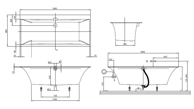 • Комплект ножек для ванны (самоклеящихся) входит в поставку, регулируются от 130 — 180 мм