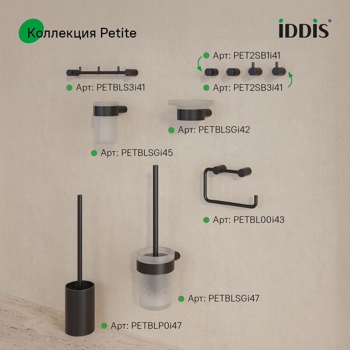 Petite – базовая коллекция функциональных аксессуаров для ванной с минималистичным, спокойным дизайном и округлыми формами, что делает её универсальным украшением любого современного санузла. Аксессуары в универсальном матовом хроме преобразят интерьер, сделают его завершённым и гармоничным. Идеально дополнят смесители IDDIS® из коллекций Aiger по цвету и форме.