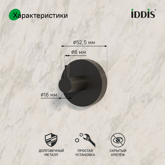 Одинарный крючок Sena чёрного матового цвета – доступное функциональное решение для современной ванной комнаты. У крючка продуманная геометрия и форма, что позволяет удобно повесить и большое полотенце, и банный халат. Sena – коллекция настенных аксессуаров с понятным базовым дизайном, который подойдёт к абсолютно любому интерьеру. Идеально дополнят смесители и сантехнику IDDIS® в тон. Основной материал – сплав металлов с надёжным порошковым окрашиванием, стойким к бытовой химии и механическим повреждениям, что позволяет эксплуатировать аксессуары во влажном помещении ванной на протяжении длительного времени. Крючок удобен в установке, монтаж не требует профессиональных навыков. Крепёжные элементы скрыты корпусом, что обеспечивает привлекательный и аккуратный внешний вид. Крепёж выдерживает вес до 5 кг. Конструкция крепежа позволяет немного скорректировать расстояние между отверстиями для саморезов, благодаря чему можно закрепить крючок в уже существующих отверстиях в плитке и не сверлить новые. Гарантия на аксессуары для ванной IDDIS® – 5 лет. (с) Авторский текст, октябрь 2025 г.