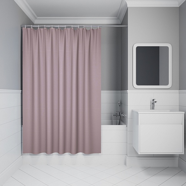 Однотонная текстильная штора для ванной розового цвета с фактурным рисунком «вафля». Напоминает классические текстильные шторы и соответствует актуальному тренду оформления ванной как уютной жилой комнаты.