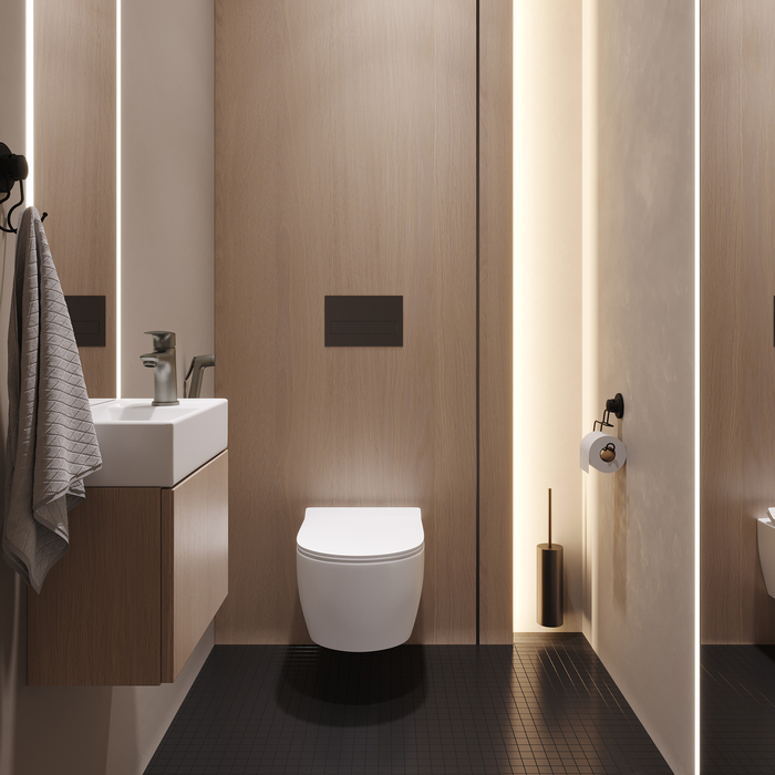 Смеситель с гигиеническим душем Rora отличается универсальным характером: основной акцент в его дизайне приходится на плавные линии корпуса. Модель в графитовом цвете одинаково выигрышно смотрится на контрастных белоснежных раковинах и дополняет собой керамику темных оттенков.