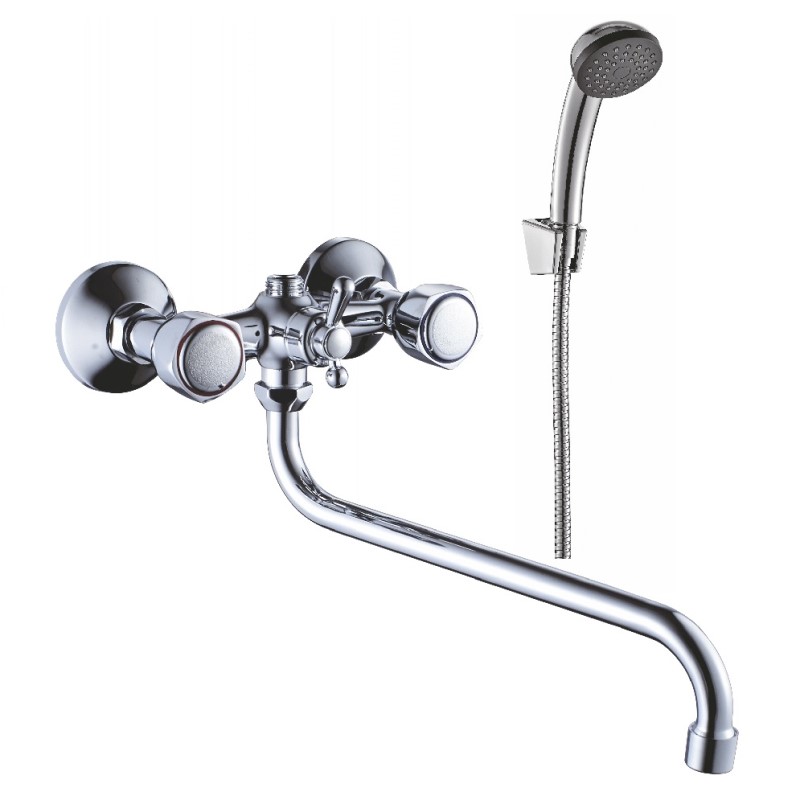 Смеситель изготовлен из металлического сплава. Переключатель потоков на корпусе смесителя. Диаметр декоративных чашек 70 мм. Душевой гарнитур в комплекте. Межосевое расстояние (расстояние между выходом горячей и холодной трубы) 150 мм. Данное расстояние изменяется за счет входящих в комплект эксцентриков на 15 мм. в большую или меньшую стороны. Цвет хром