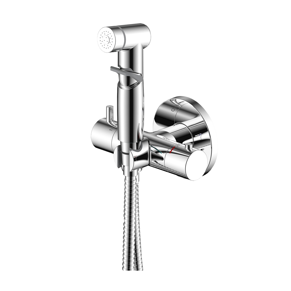 В комплекте:Термостатический картриджПереключатель с керамическими пластинамиАксессуары в комплекте (шланг 1,2 м, лейка гигиенического душа с нажимным механизмом)Металлические рукоятки