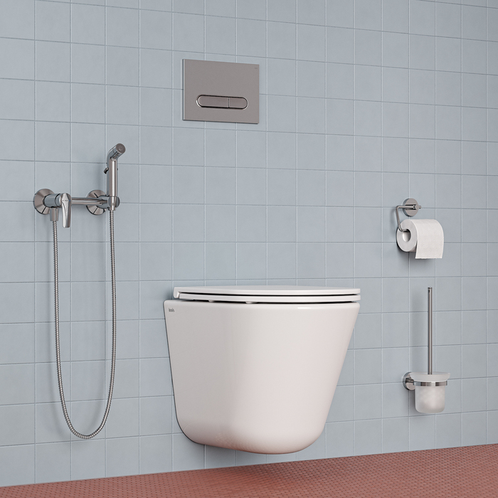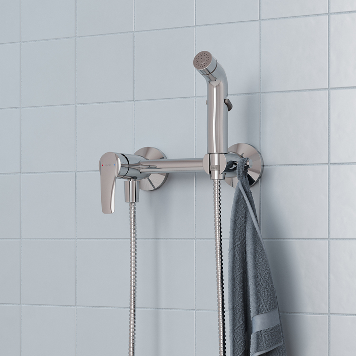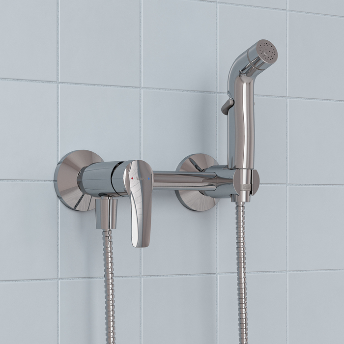 Смеситель с гигиеническим душем Ray наружного монтажа на два отверстия в классическом хроме – универсальный практичный дизайн, который подойдёт для разных интерьеров в современном стиле. В комплекте однорежимная лейка и душевой шланг в оплётке из нержавеющей стали (1,2 м) с двумя коническими гайками. Крючок для полотенца справа от лейки.